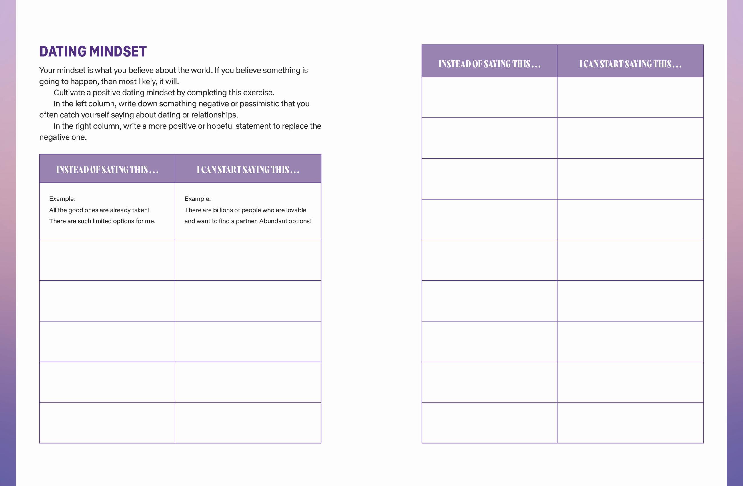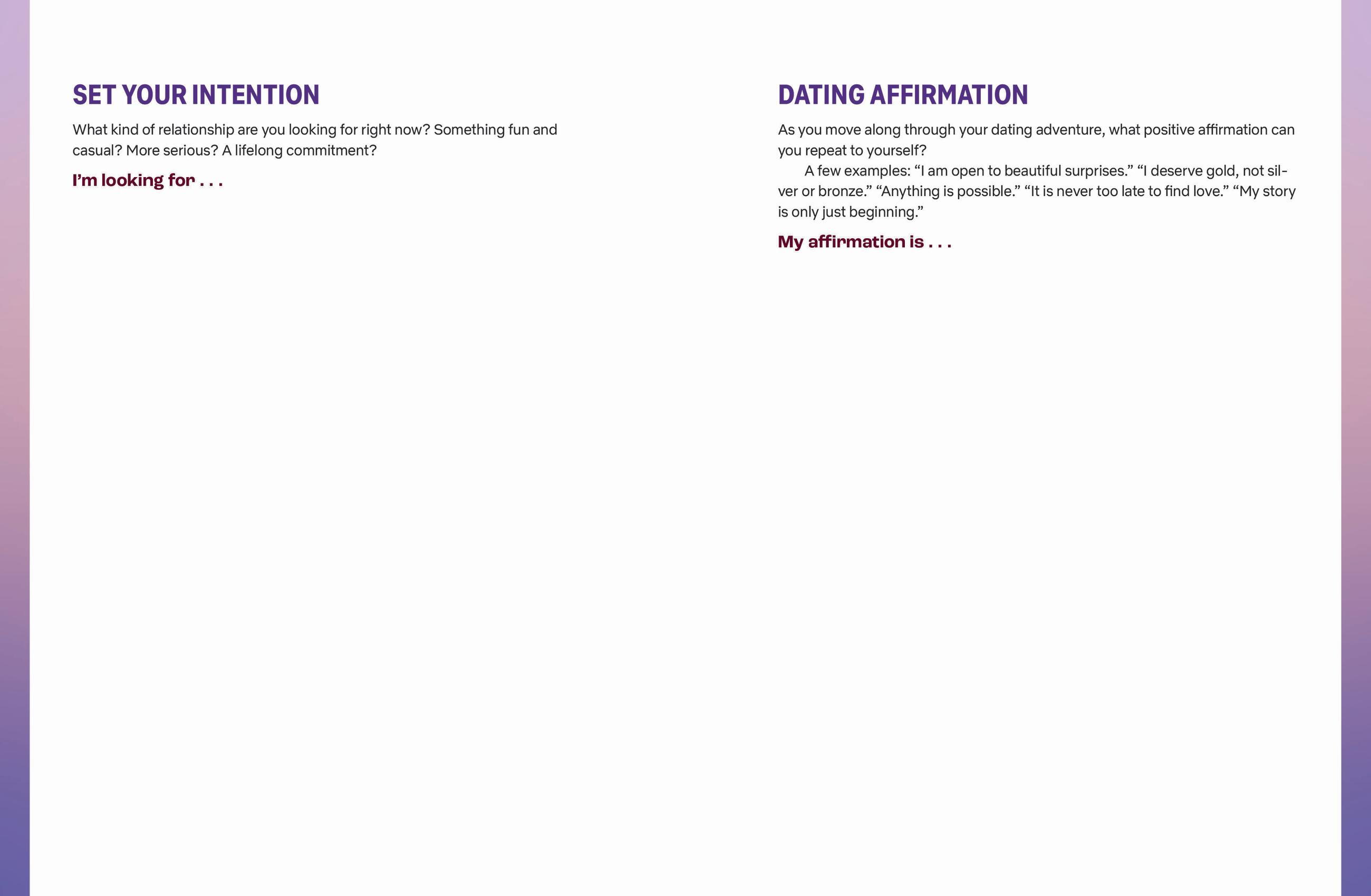 - Answer questions to discover new things about themselves, clarify what they want and don’t want in a partner, and what they bring to the table in a relationship.