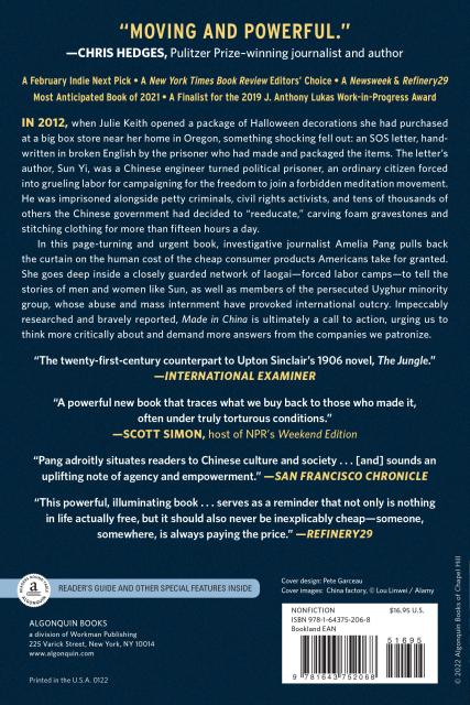 In Made in China, investigative journalist Amelia Pang pulls back the curtain on Sun’s story and the stories of others like him, including the persecuted Uyghur minority group, whose abuse and exploitation is rapidly gathering steam. What she reveals is a closely guarded network of laogai—forced labor camps—that power the rapid pace of American consumerism. Through extensive interviews and firsthand reportage, Pang shows us the true cost of America’s cheap goods and shares what is ultimately a call to action—urging us to ask more questions and demand more answers from the companies we patronize.