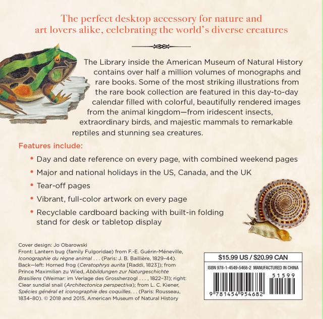 Inside the American Museum of Natural History is an eight-story library—one of the largest natural-science libraries in the Western Hemisphere—that contains nearly half a million volumes of illuminated monographs, pamphlets, reprints, and original rare books. Some of the most striking images from that collection are featured in this day-to-day calendar filled with colorful, beautifully rendered images from the animal kingdom—from iridescent insects, extraordinary birds, and majestic mammals to stunning sea creatures. With tear-off pages, day and date reference on every page, major and national holidays, and combined weekend pages, it is the ideal desktop accessory for natural science and art lovers alike.