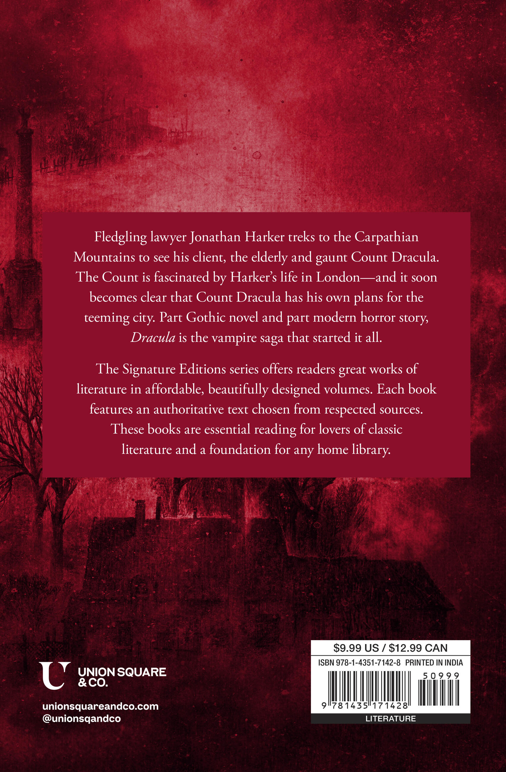 Fledgling English lawyer Jonathan Harker treks into the Carpathian Mountains to complete a real estate transaction—despite the frightening warnings of the horrible dangers that await him. Harker’s client is the ancient Count Dracula, who lives in a sumptuously furnished castle—one strangely devoid of mirrors. Harker soon realizes that the Count’s interest in London is more than idle curiosity, and is woefully unprepared for the Count’s obsession with Harker’s fiancée, Mina . . .