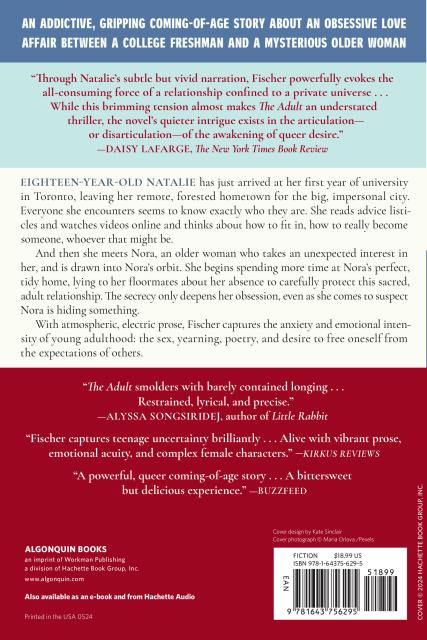 “Through Natalie’s subtle but vivid narration, Fischer powerfully evokes the all-consuming force of a relationship confined to a private universe . . . While this brimming tension almost makes The Adult an understated thriller, the novel’s quieter intrigue exists in the articulation—or disarticulation—of the awakening of queer desire.”Daisy Lafarge, The New York Times Book Review