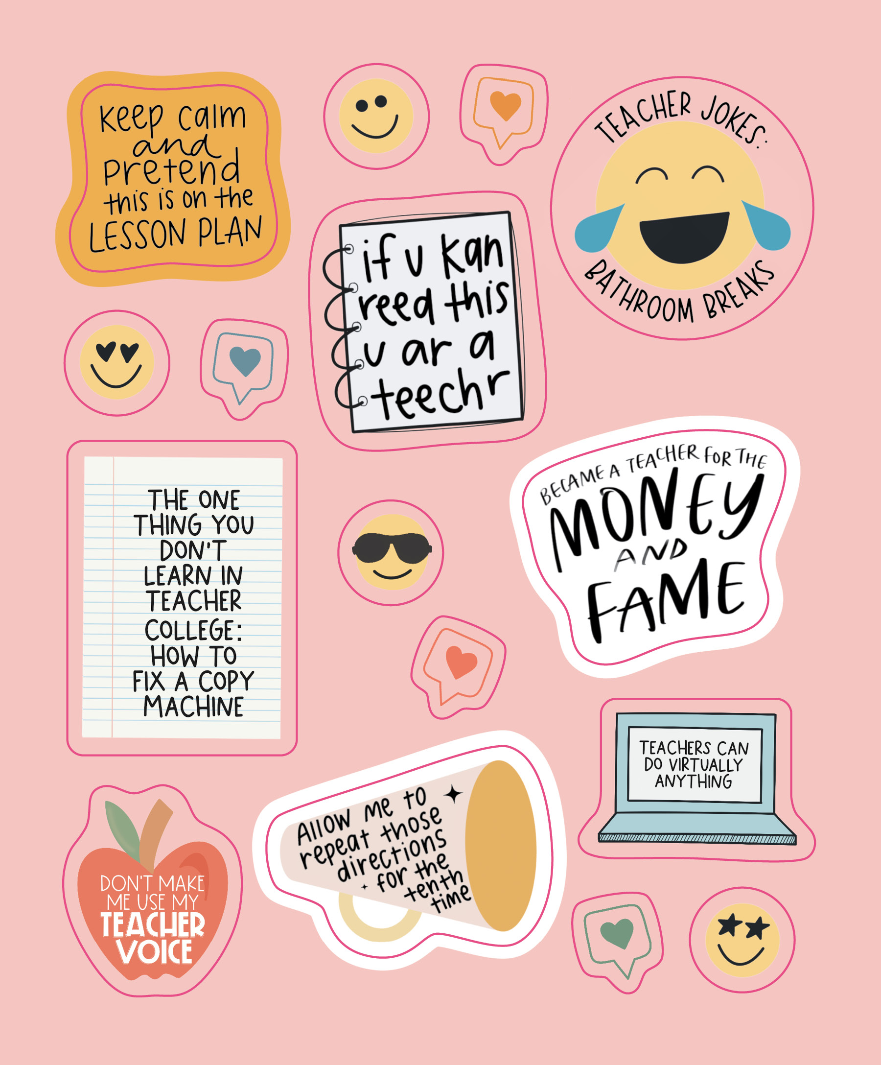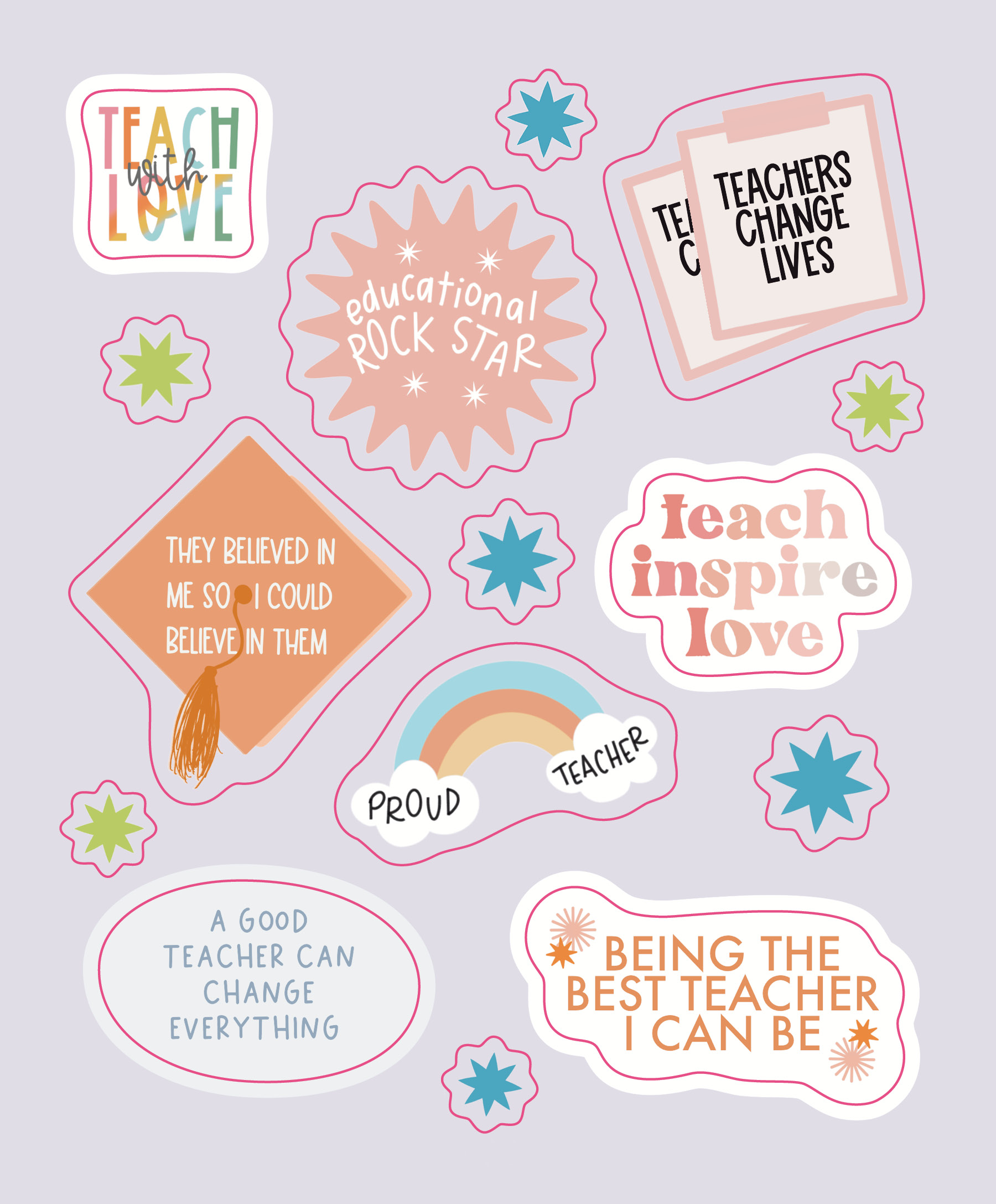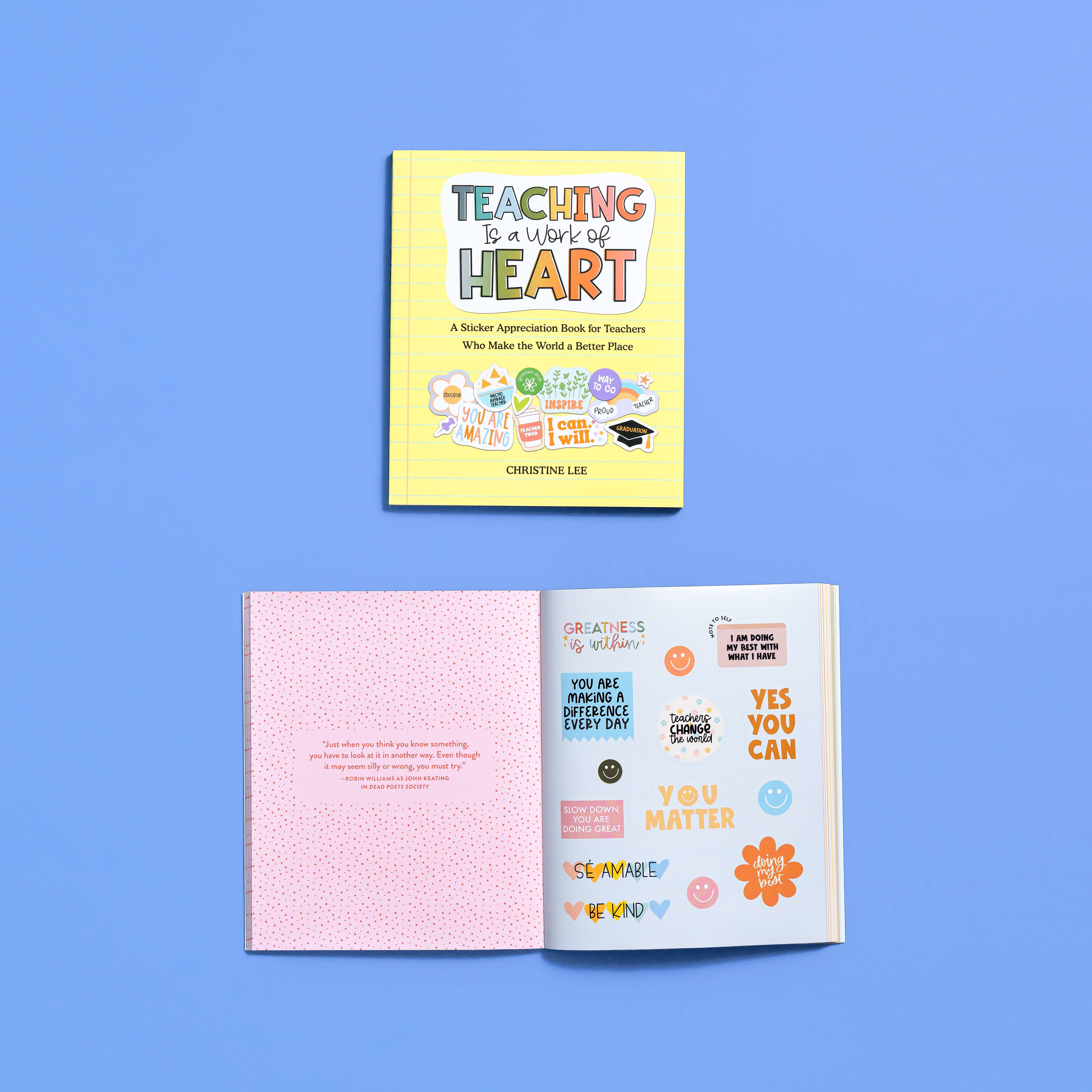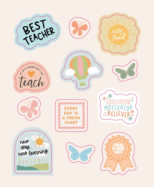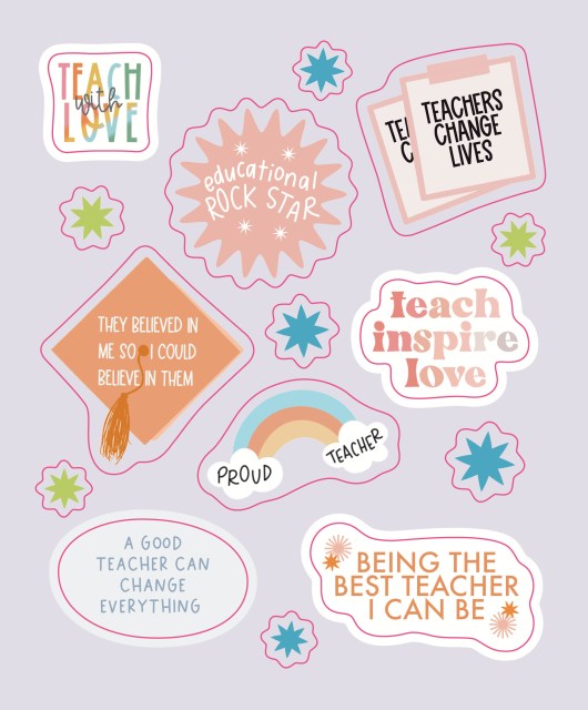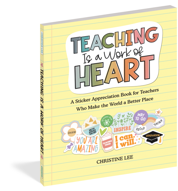 Celebrate teachers and all they do with this uplifting collection of original stickers in all shapes and sizes and filled with words that speak to the life. There are stickers of appreciation (Teachers change the world) and stickers that energize, especially on a day with challenges (You got this!). Stickers with humor (Three reasons to become a teacher: June, July, August) and stickers that just get it (Tired as a teacher). Inspiring quotes are on the back of each sheet, such as “One child, one teacher, one book, and one pen can change the world”—Malala Yousafzai. And yes, there are many, many stars!