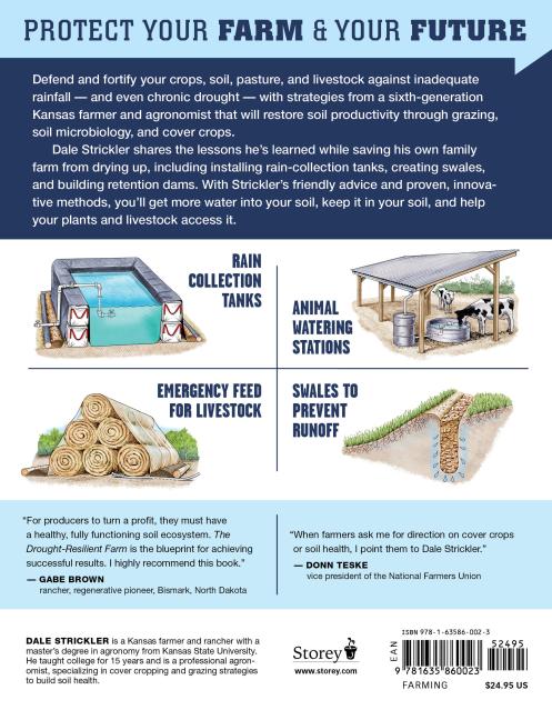 Rainfall levels are rarely optimal, but there are hundreds of things you can do to efficiently conserve and use the water you do have and to reduce the impact of drought on your soil, crops, livestock, and farm or ranch ecosystem. Author Dale Strickler introduces you to the same innovative systems he used to transform his own drought-stricken family farm in Kansas into a thriving, water-wise, and profitable enterprise, maximizing healthy cropland, pasture, and water supply. Ranging from simple, short-term projects such as installing rain-collection ollas to long-term land-management planning strategies, Strickler’s methods show how to get more water into the soil, keep it in the soil, and help plants and livestock access it.