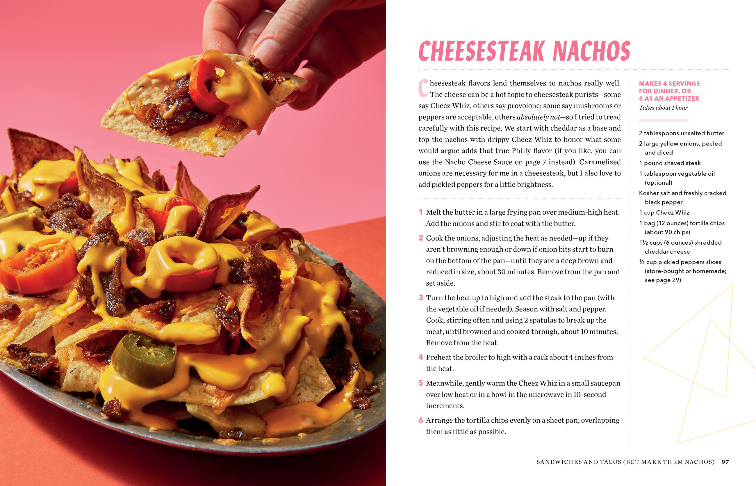 Of course there’s the chips-and-cheese classic, but then the nachos veer decidedly into dinner, with favorites from every part of the meal from French Onion Nachos, Buffalo Chicken Nachos, and Cobb Salad Nachos to Fish Taco Nachos, Banh Mi Nachos, and Shrimp and Grits Nachos. And there are plenty of not-chos (that is, nachos that use other ingredients for the chips)—like Lasagnachos, Scallion Pancake Nachos, and Pretzel and Brat’chos. Even Apple Pie Nachos for dessert.