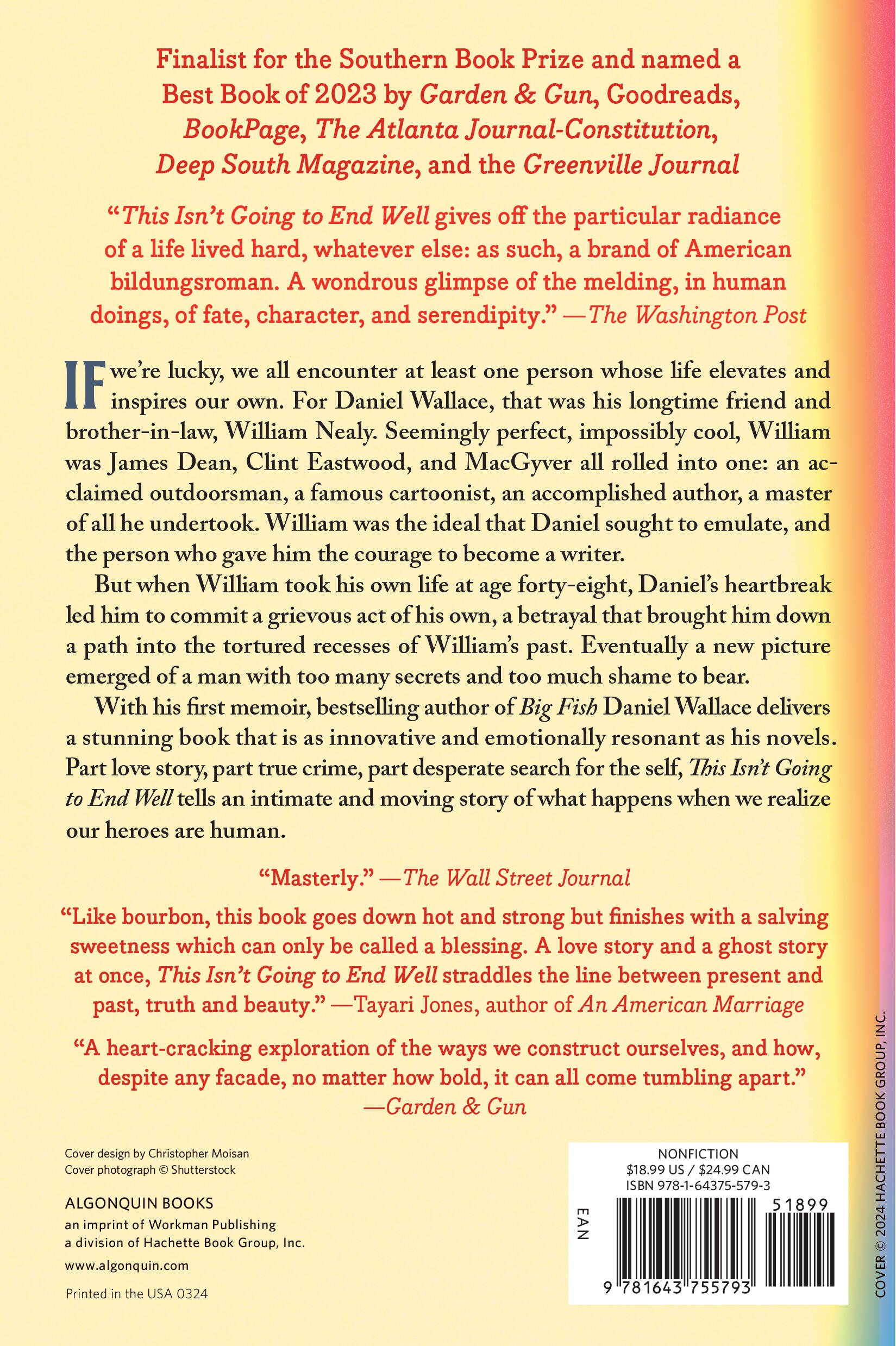 “What Wallace achieves in This Isn’t Going to End Well is a hard-wrung reconciliation: between him and Nealy, yes, but also with the public and private selves we all cultivate, selves sometimes woven together and other times, as with Nealy, partitioned. Was Nealy one of the two selves, Wallace asks, “or both?”. . . A heart-cracking exploration of the ways we construct ourselves, and how, despite any facade, no matter how bold, it can all come tumbling apart.”Jonathan Miles, Garden & Gun