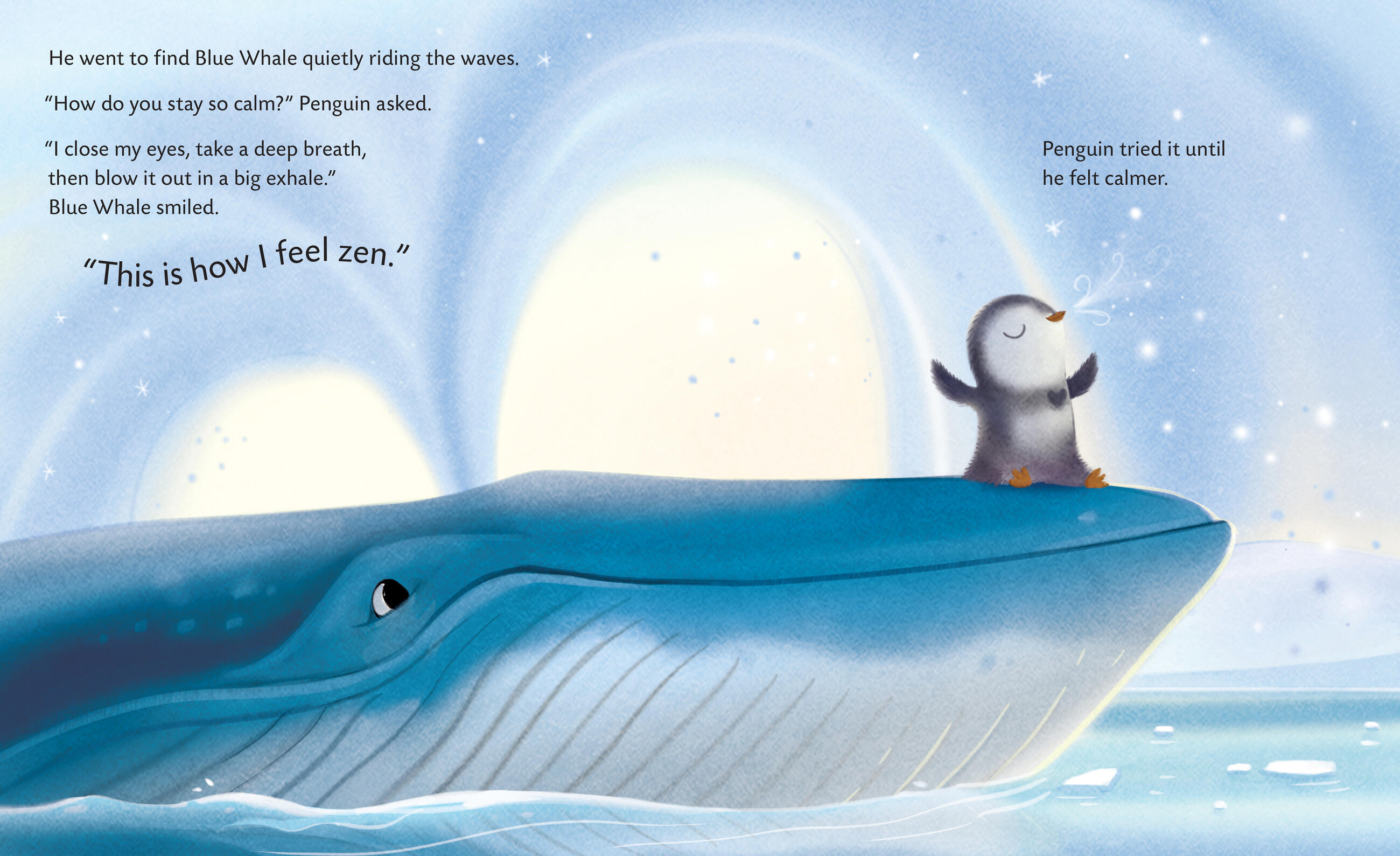 Penguin is anxious amidst the hustle and bustle of his busy colony. He wishes to feel calm inside, but he doesn’t know how! Thankfully, a few of his Antarctica friends teach him their strategies for finding inner peace. Before long, Penguin can use his own zen techniques to handle a stressful situation, earning him his new name—Zenguin!