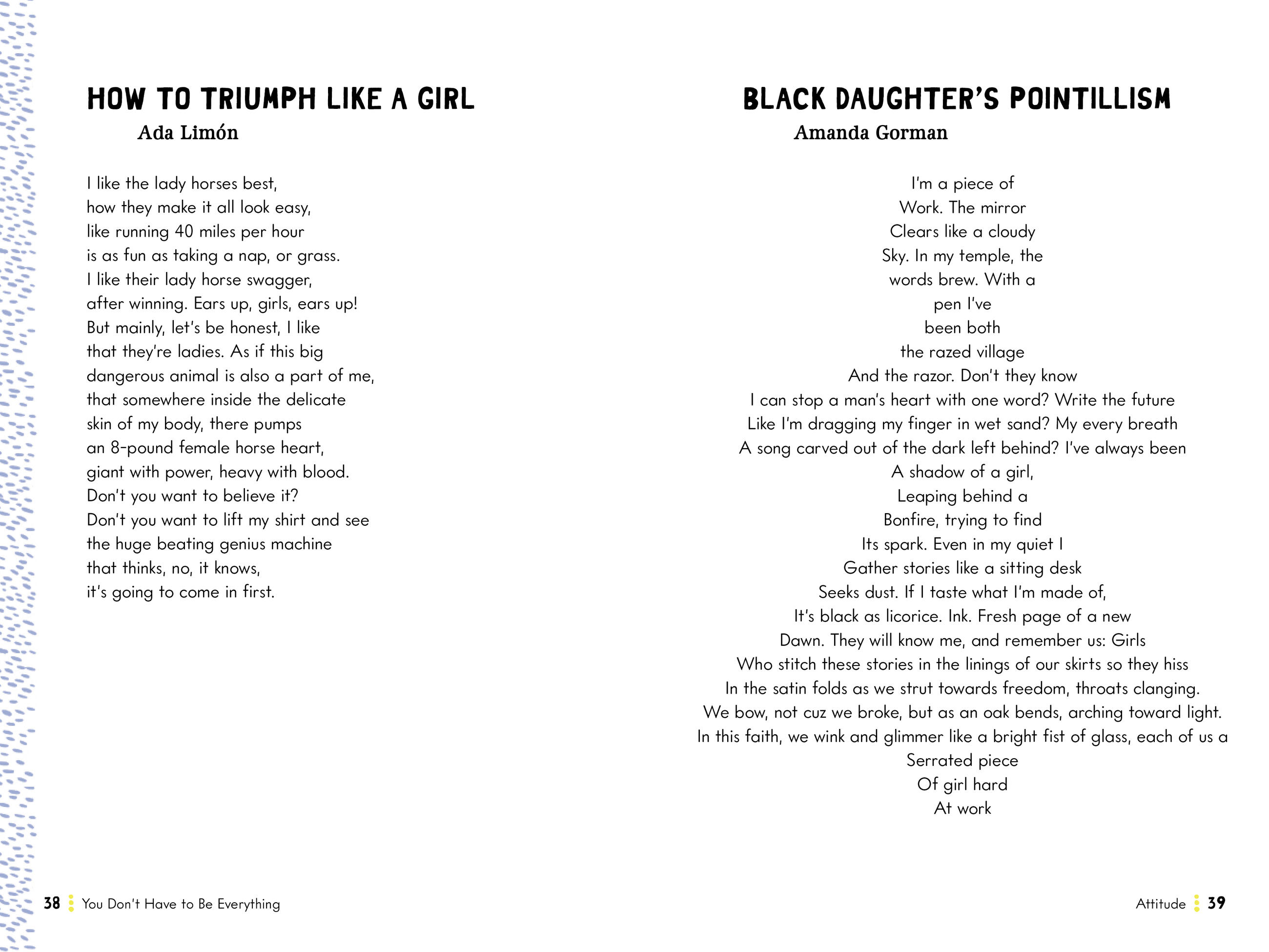 The cast of 68 poets is extraordinary: Amanda Gorman, the first National Youth Poet Laureate, who read at Joe Biden’s inauguration; bestselling authors like Maya Angelou, Elizabeth Acevedo, Sharon Olds, Naomi Shihab Nye, and Mary Oliver; Instagram-famous poets including Kate Baer, Melody Lee, and Andrea Gibson; poets who are LGBTQ, poets of diverse racial and cultural backgrounds, poets who sing of human experience in ways that are free from conventional ideas of femininity. Illustrated in full color with work by three diverse artists, this book is an inspired gift for daughters and granddaughters—and anyone on the path to becoming themselves.