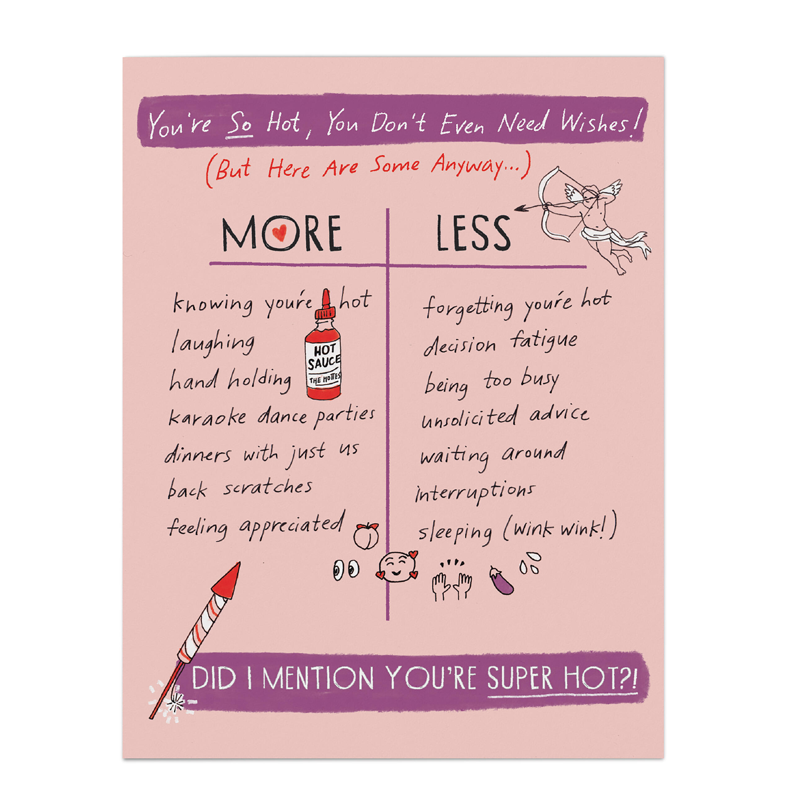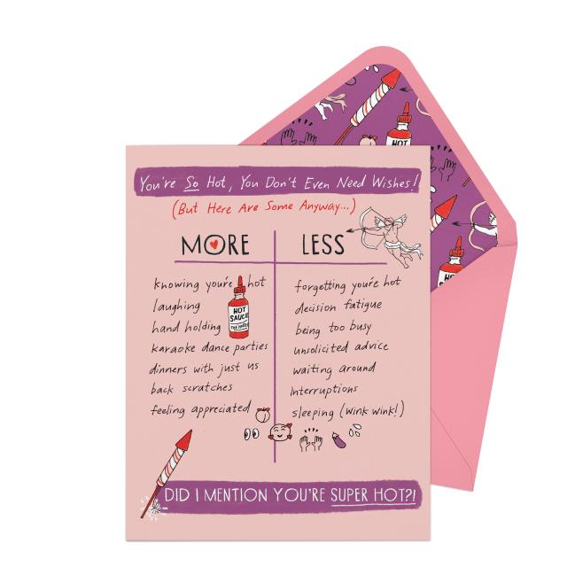 Seize the opportunity to let your person know you think they’re HOT HOT HOT — and not in a summer-day-climate-change kind of way, but more of a come-here-right-now-so-I-can make-out-with-you kind of way. This card is great for Valentine’s Day, as a happy anniversary card, or a just-because-you’re-you card.