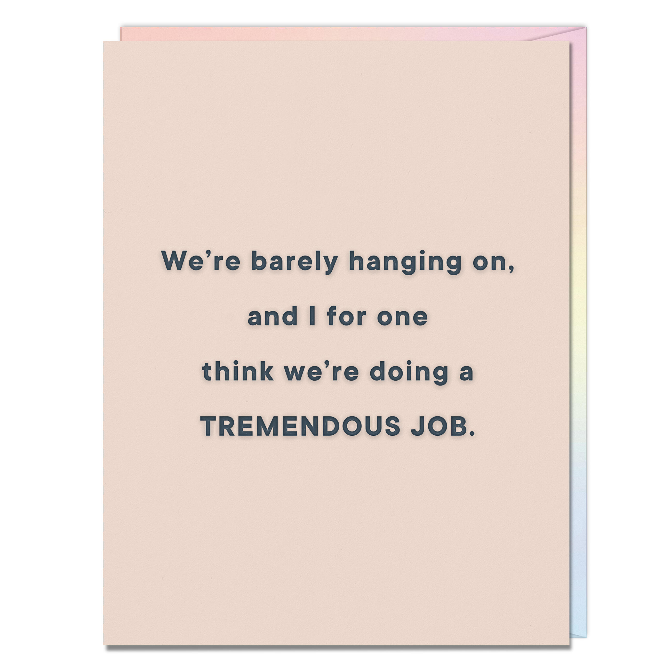 Card reads: We’re barely hanging on, and I for one think we’re doing a TREMENDOUS JOB.