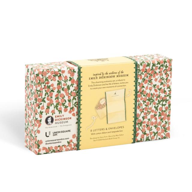 Housed in a keepsake box, the set includes eight blank writing sheets and coordinating envelopes, each printed with a reproduction of Emily Dickinson’s distinctive handwriting. The set evokes the intimate world in which Dickinson worked, offering a simple but meaningful space for reflection, correspondence, or creative thought. Whether used as personal stationery or given as a thoughtful gift, this set offers a tactile connection to the enduring presence of Emily’s voice and vision.