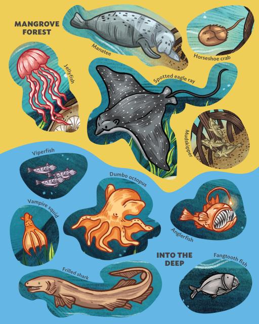 From those dwelling on the shore and in the air like polar bears, emperor penguins, sea otters, and albatross, to the swimmers like clownfish, moray eels, lionfish, hammerhead sharks, dumbo octopuses, and Beluga whales, to the deep sea bottom dwellers like hermit crabs, sea squirts, barnacles, and giant clams, kids will love following the clues to match the creature to its place on the poster. The completed poster, measuring 15 x 28 inches, makes a stunning piece of wall art that kids can feel proud to display.