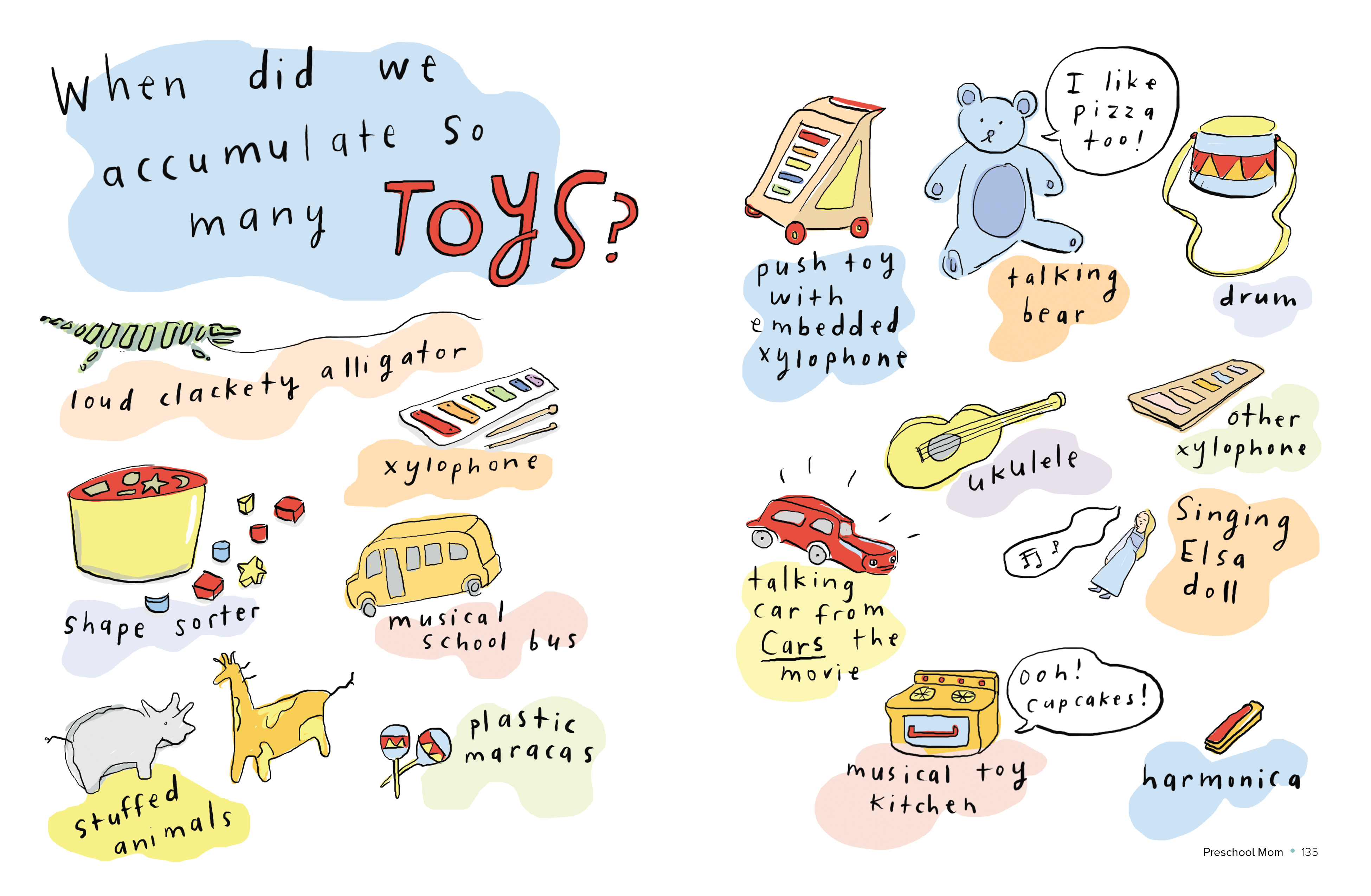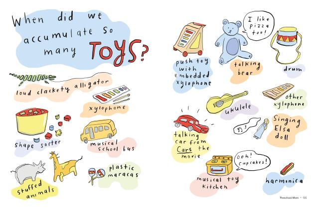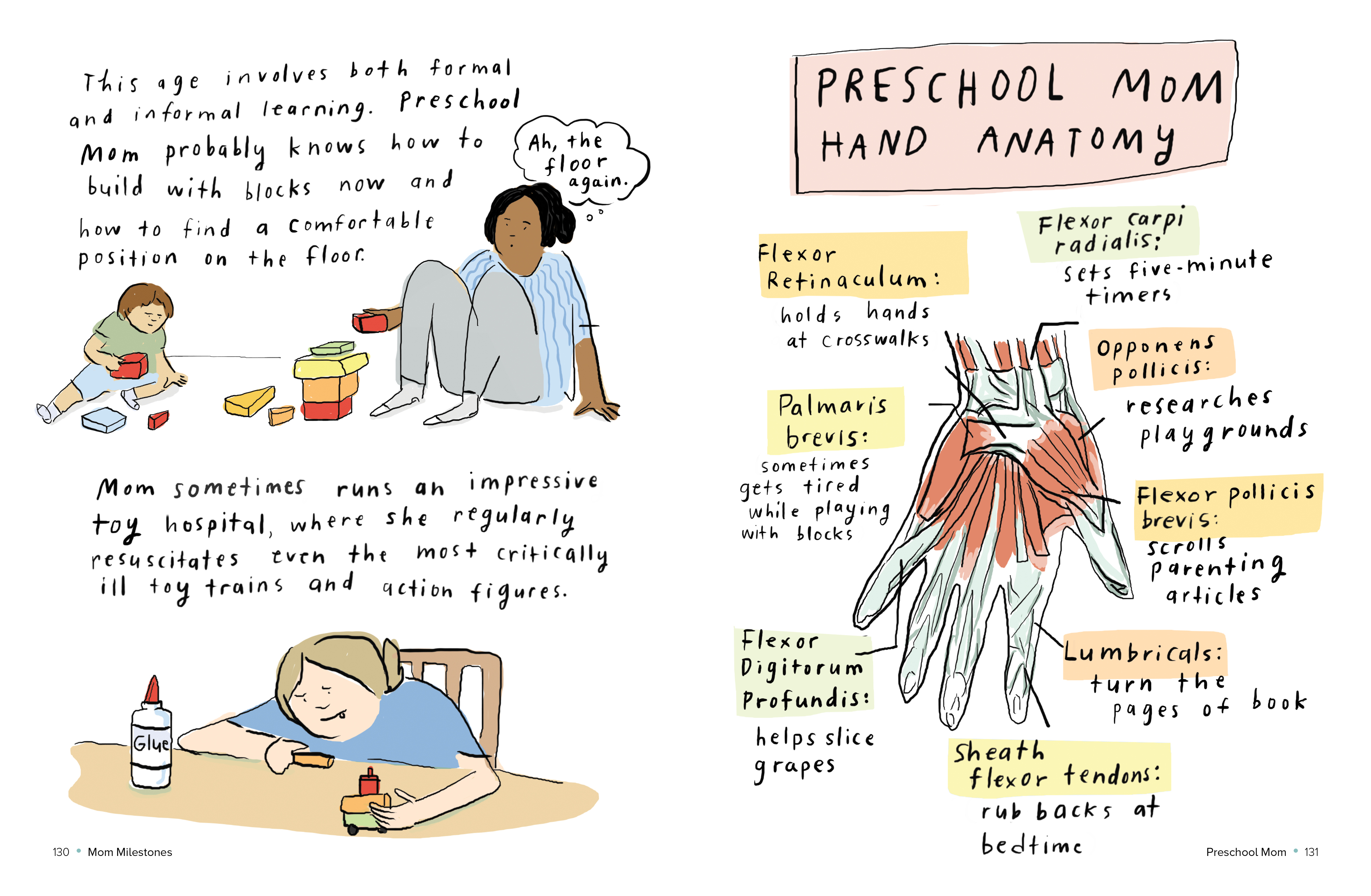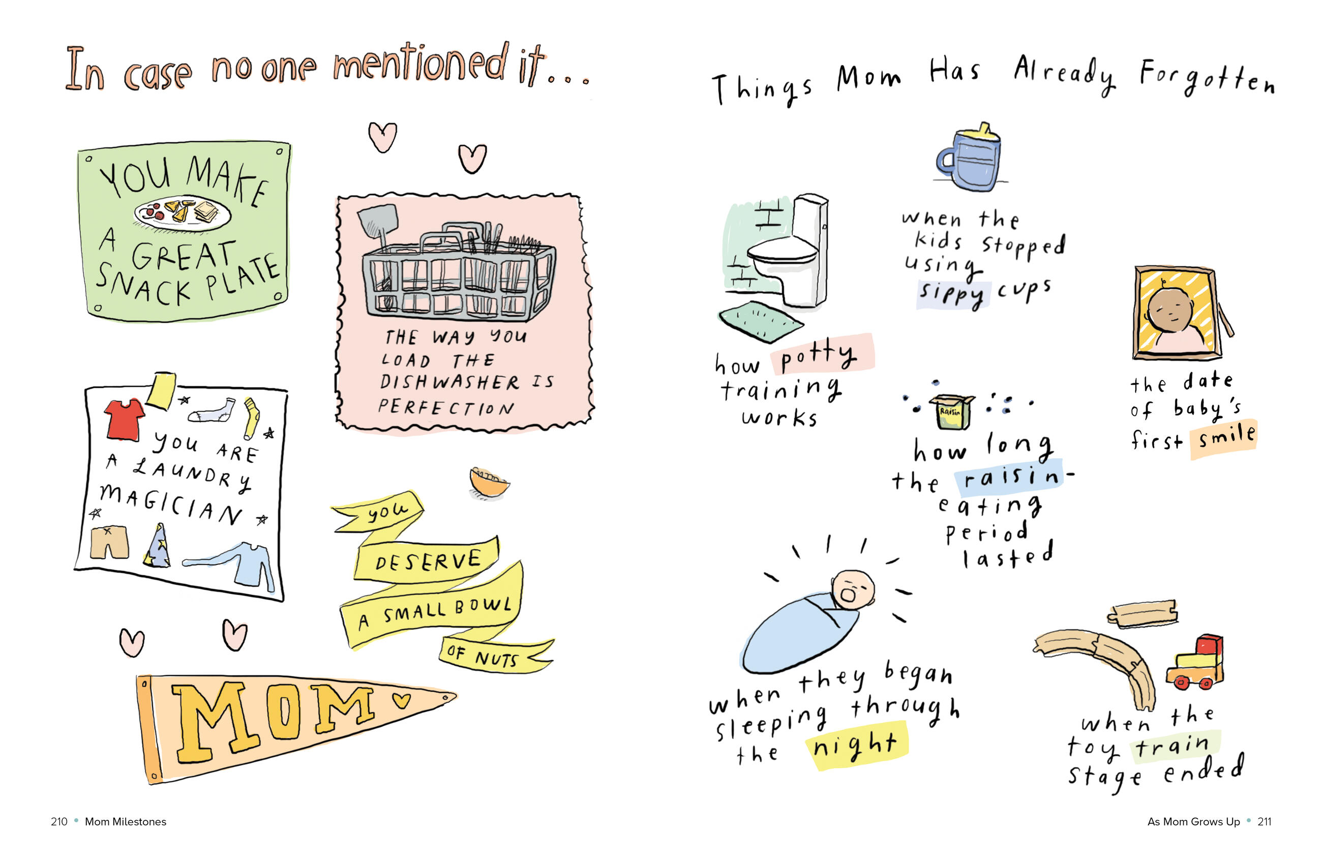 Beginning with one-day-old mom, who may feel like she is learning a new language, Mom Milestones is a love letter to the myriad ways moms grow and adapt to motherhood. Here are significant firsts: First sleepless night. First walk with baby. First mom friend. Skills learned—how to soothe baby (sometimes); how to coax a preschooler into taking medicine. Mom’s likes (adapting pop songs to lullaby format; gathering intelligence from other moms) and dislikes (emptying the lunch box with mystery smells; requests for video games). There’s Bedtime: The Board Game; crafts mom enjoys (no glitter or glue, thanks!); and the ABCs of motherhood (E for ennui).