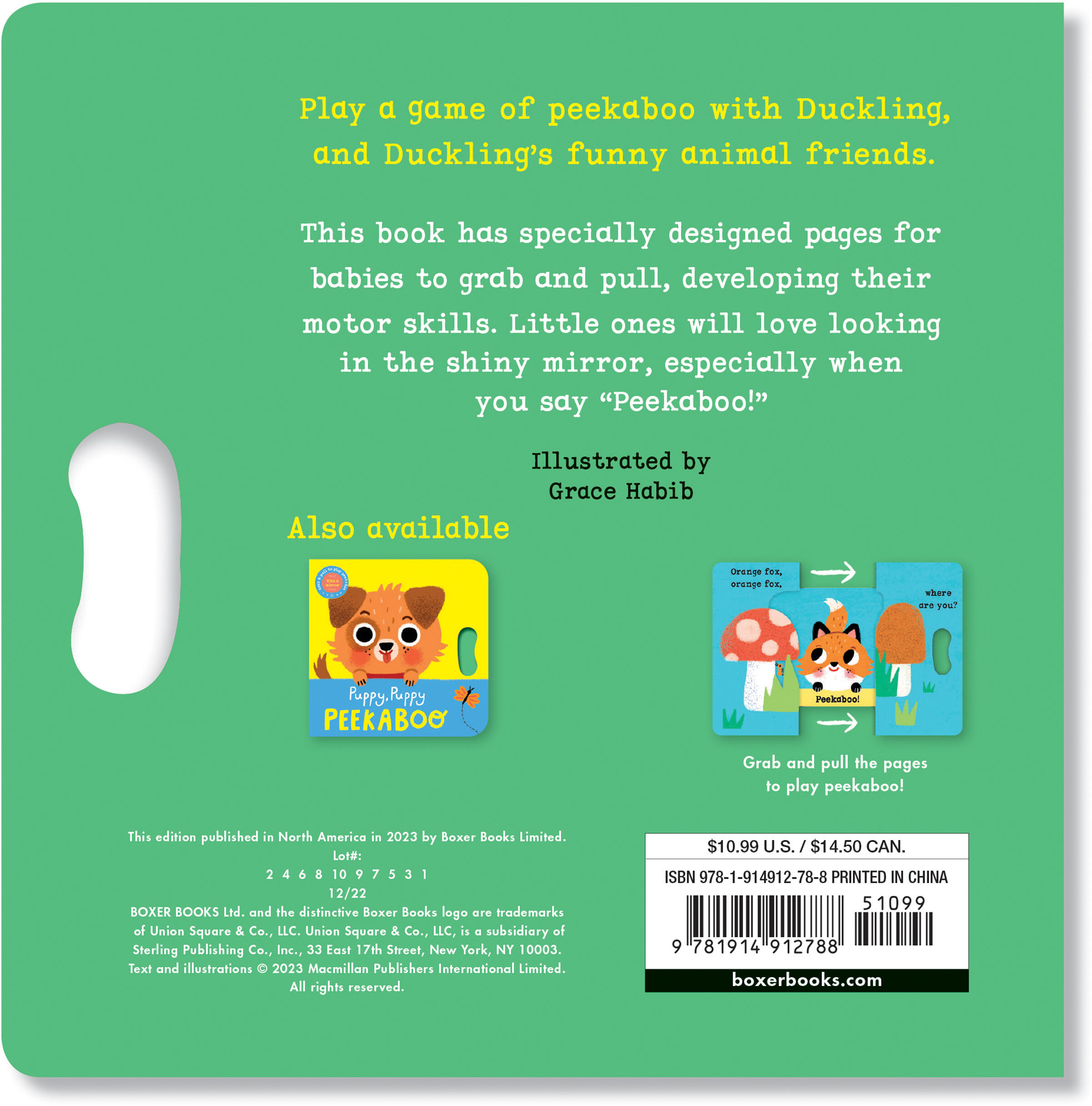 In Duckling, Duckling PEEKABOO!, little ones’ favorite game is brought to life with easy grab-and-pull mechanisms and a shiny mirror.