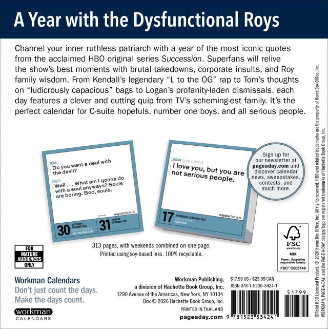- FOR SERIOUS PEOPLE: This officially licensed calendar is perfect for anyone who can’t get enough of the Roy family’s antics. Here’s a year of Logan’s wisdom, Roman’s humor, Shiv’s wit, and Kendall’s business acumen, plus more quotes from all your favorite characters.