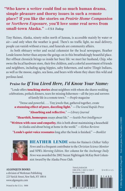 “Part Annie Dillard, part Anne Lamott, essayist and NPR commentator Heather Lende introduces readers to life in the town of Haines, Alaska . . . subtly reminding readers to embrace each day, each opportunity, each life that touches our own and to note the beauty of it all.” —The Los Angeles Times
