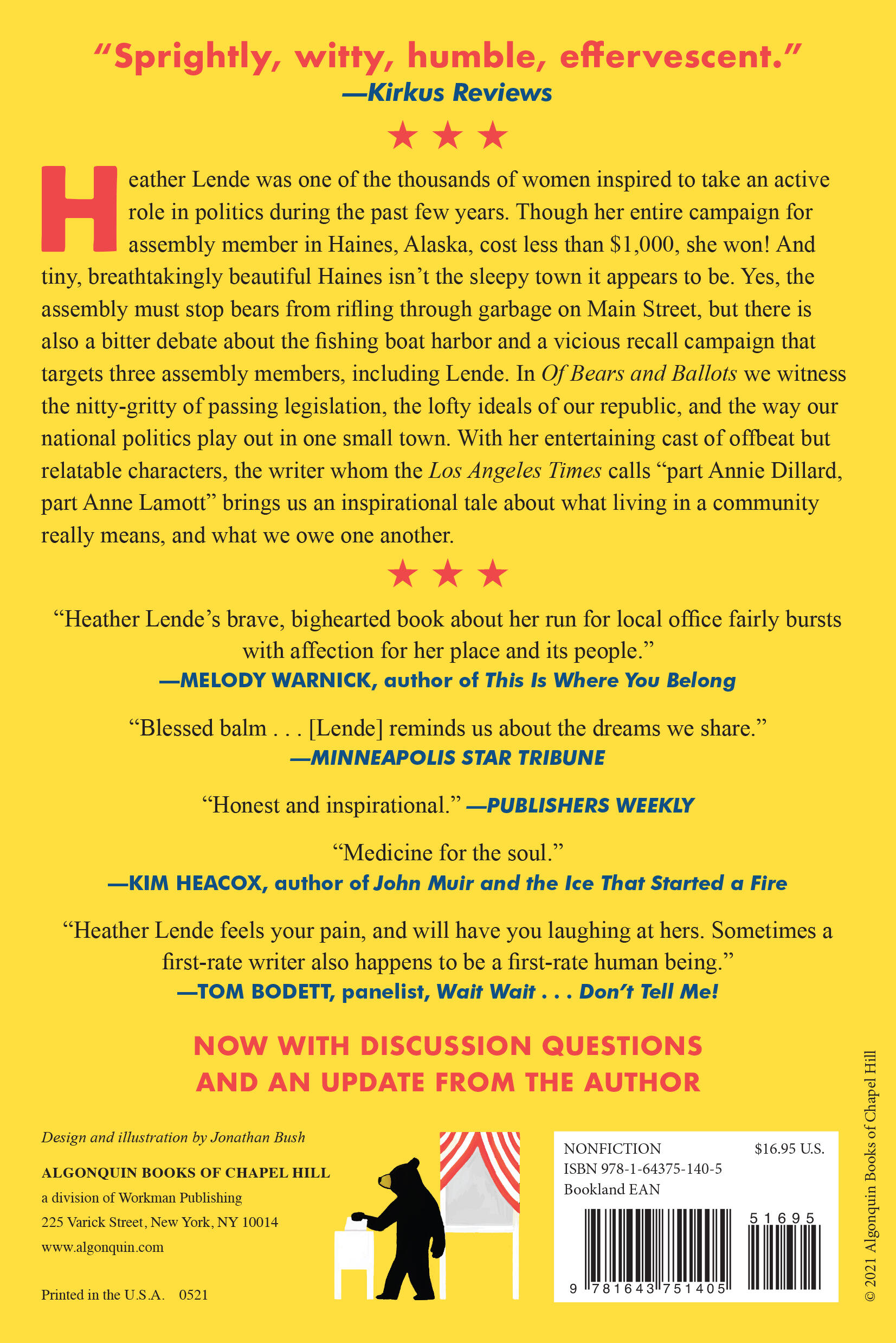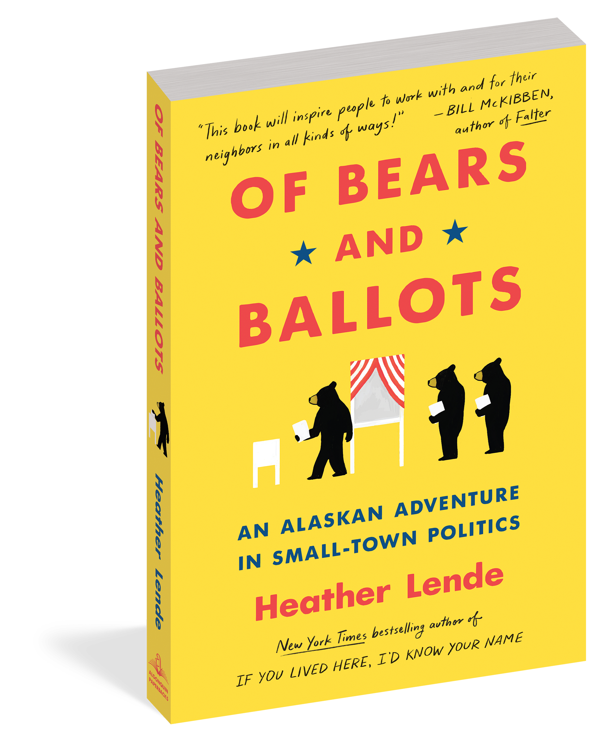 Heather Lende was one of the thousands of women inspired to take an active role in politics during the past few years. Though her entire campaign for assembly member in Haines, Alaska, cost less than $1,000, she won! And tiny, breathtakingly beautiful Haines isn’t the sleepy town it appears to be. Yes, the assembly must stop bears from rifling through garbage on Main Street, but there is also a bitter debate about the fishing boat harbor and a vicious recall campaign that targets three assembly members, including Lende. In Of Bears and Ballots we witness the nitty-gritty of passing legislation, the lofty ideals of our republic, and the way our national politics play out in one small town. With her entertaining cast of offbeat but relatable characters, the writer whom the Los Angeles Times calls “part Annie Dillard, part Anne Lamott” brings us an inspirational tale about what living in a community really means, and what we owe one another.