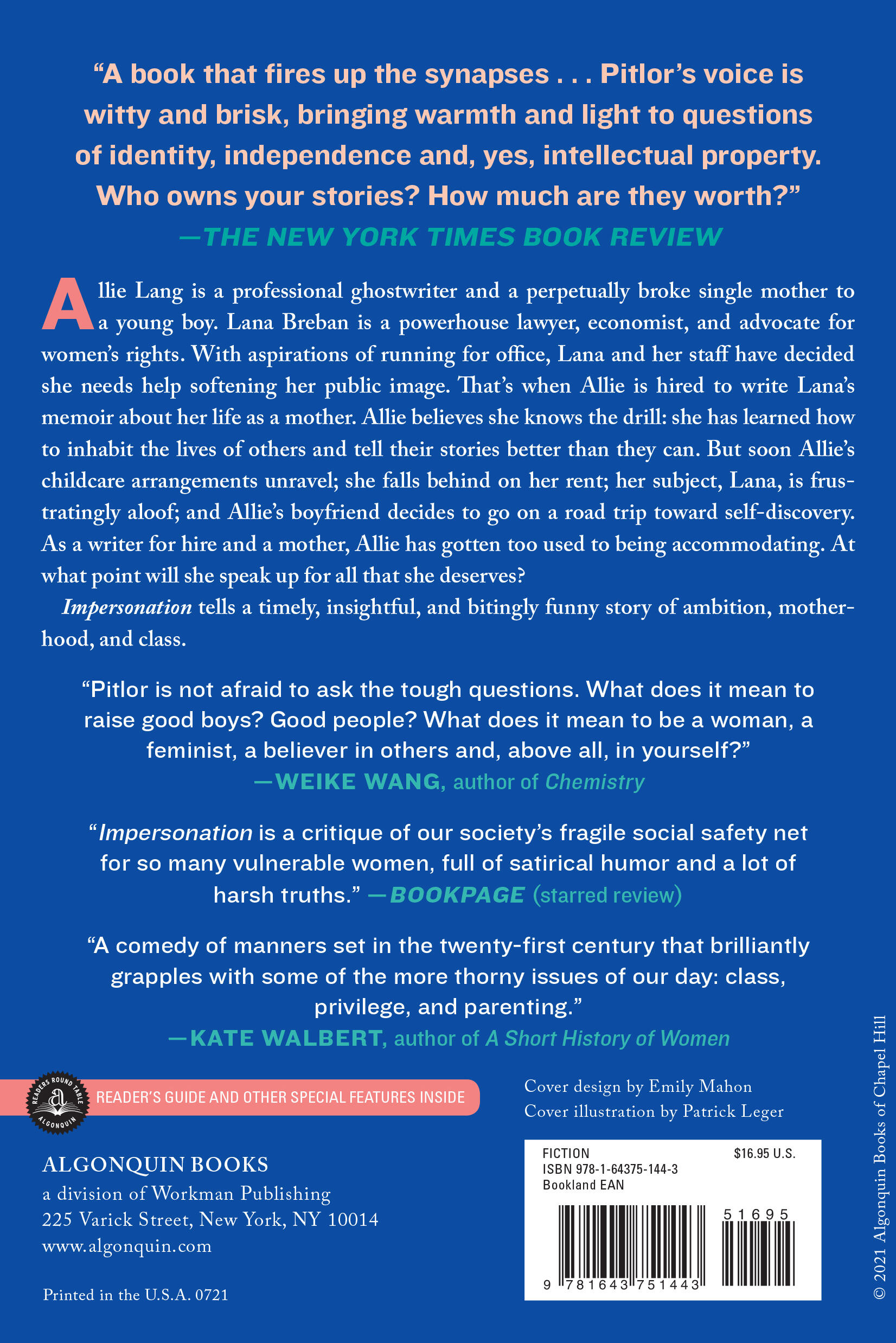 “Looking for a book that fires up the synapses? Check out Heidi Pitlor’s Impersonation . . . Pitlor’s voice is witty and brisk, bringing warmth and light to questions of identity, independence and, yes, intellectual property. Who owns your stories? How much are they worth? Allie Lang’s answers are complicated. Watching her reach them is like sitting down with a refreshingly honest friend who skips the part about how great her life is and dives right into the real stuff. We need more friends like this. Authors, too.”Weike Wang, author of Chemistry