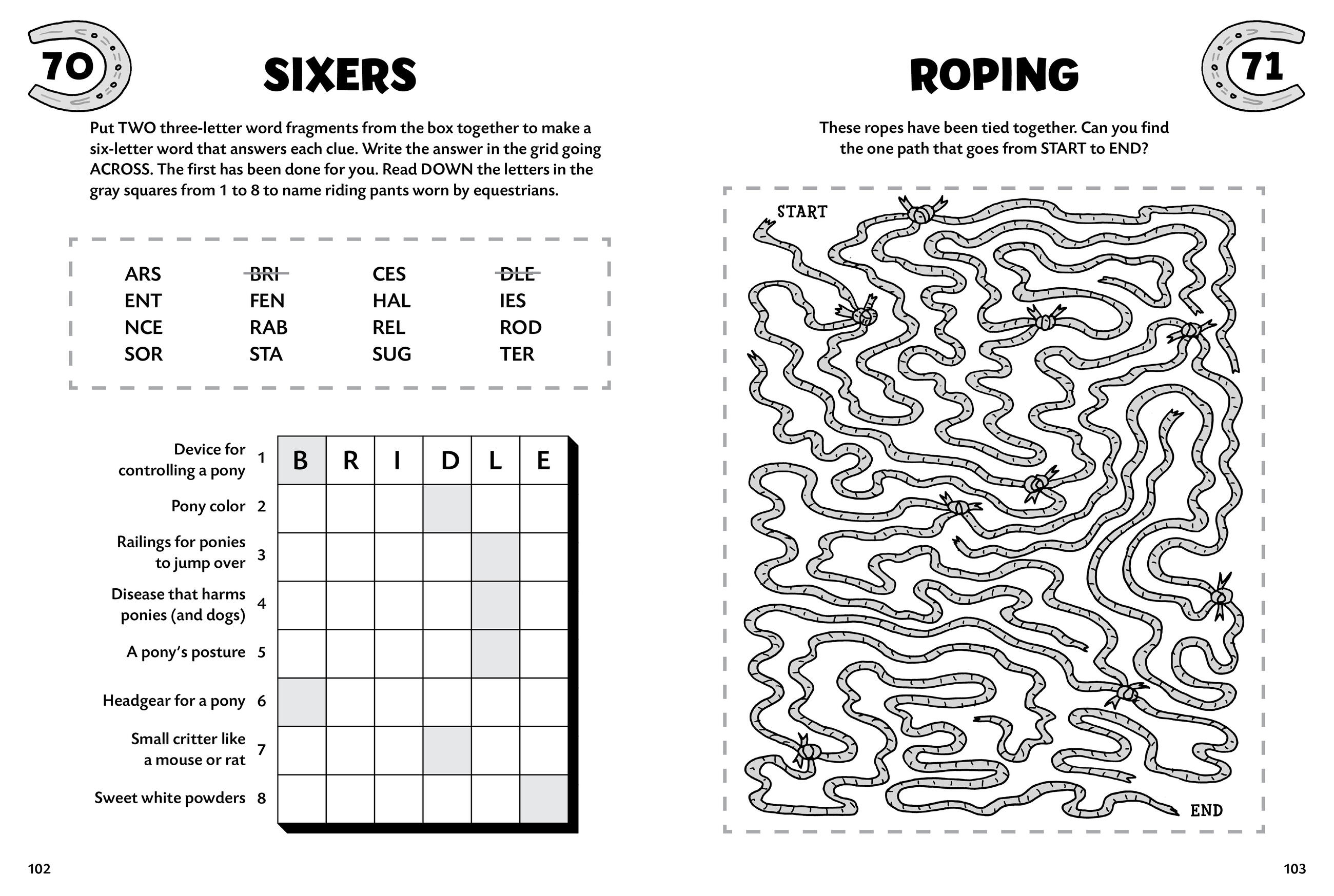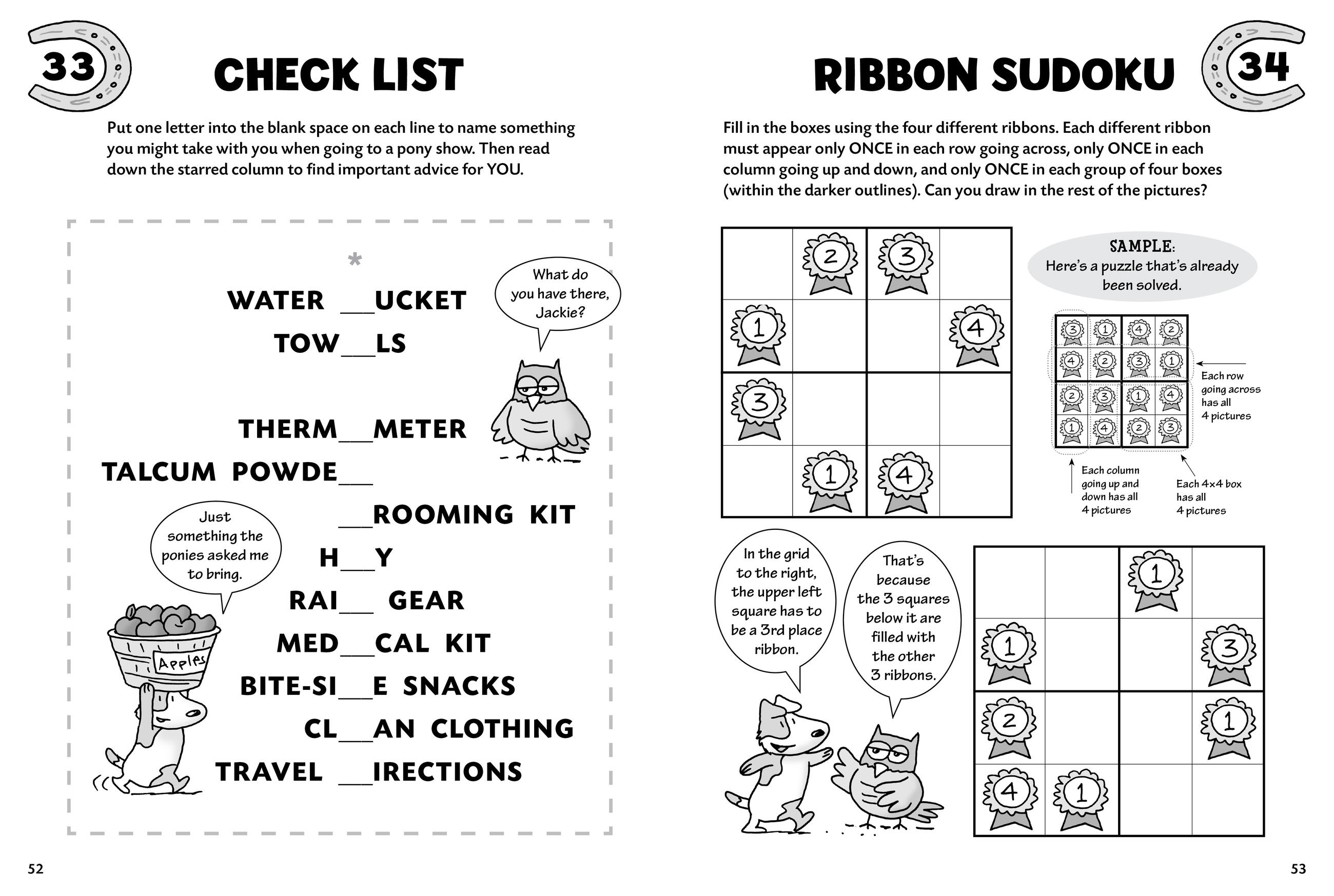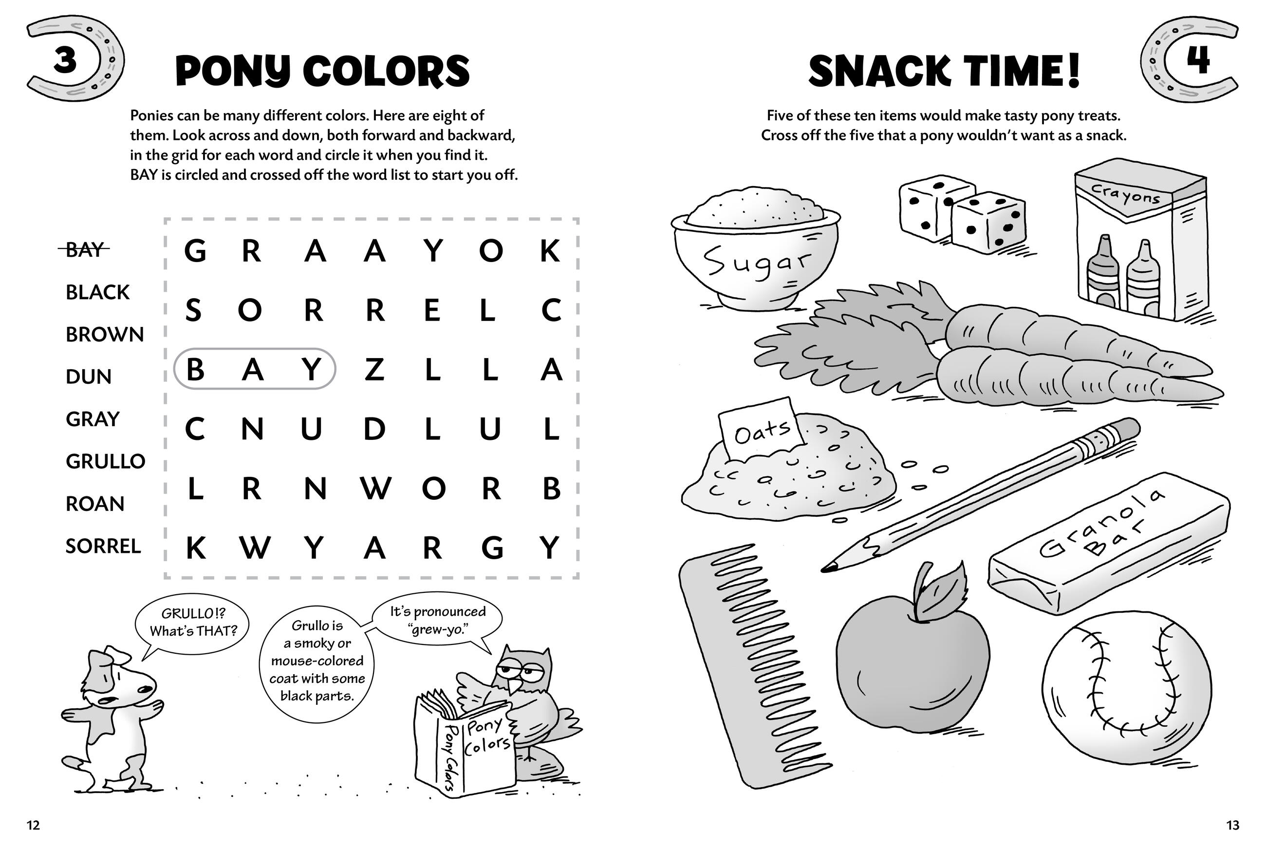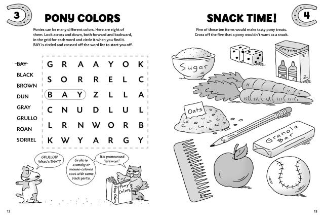 Get in the saddle and ride your way through a variety of pony-themed mazes, crosswords, quizzes, and word searches. Jackie the Jack Russell terrier and Barney the barn owl guide children through a puzzle-packed tour around the horse farm. Their silly, horsey humor will bring laughs galore and keep kids engaged as they work their way through 100 fun brainteasers. Five chapters of zany activities progress in difficulty, encouraging children to stretch their abilities as they learn more about ponies.