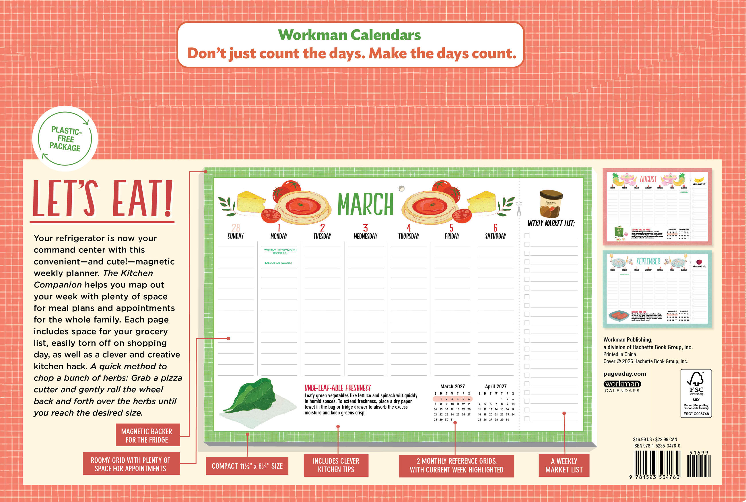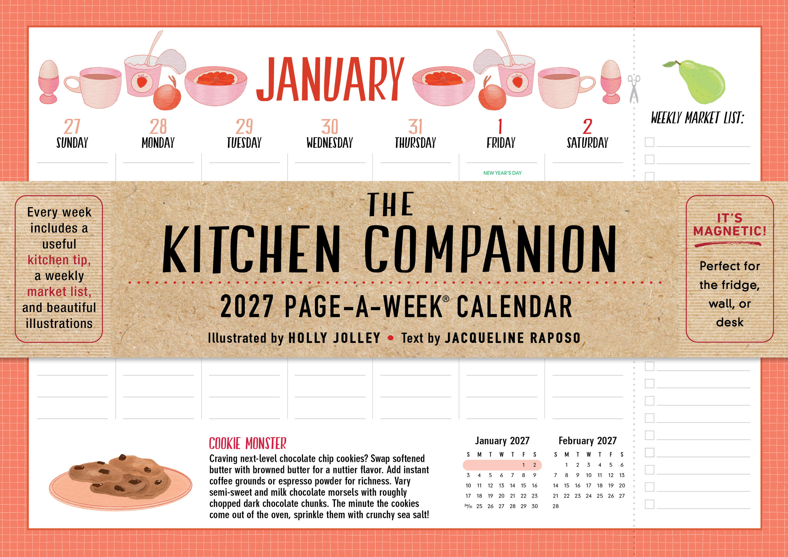 - THE ULTIMATE KITCHEN CALENDAR: Includes space for your grocery list, clever kitchen tips, and charming food-themed illustrations to cheer up your meal planning.
