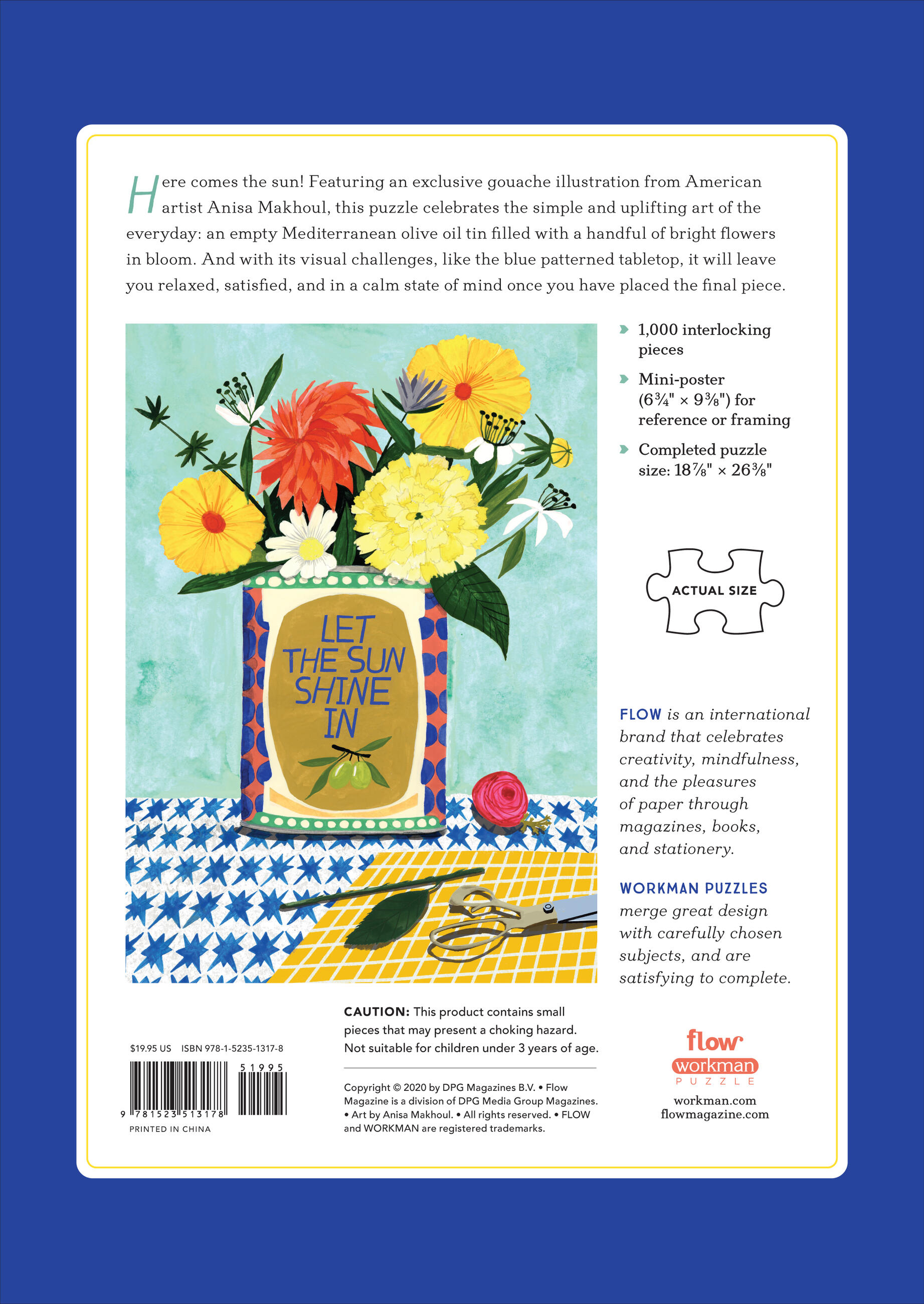 Featuring an exclusive gouache illustration from American artist Anisa Makhoul, this puzzle celebrates the simple and uplifting art of the everyday: an empty Mediterranean olive oil tin filled with a handful of bright flowers in bloom. And with its visual challenges, like the blue patterned tabletop, it will leave you relaxed, satisfied, and in a calm state of mind once you have placed the final piece.