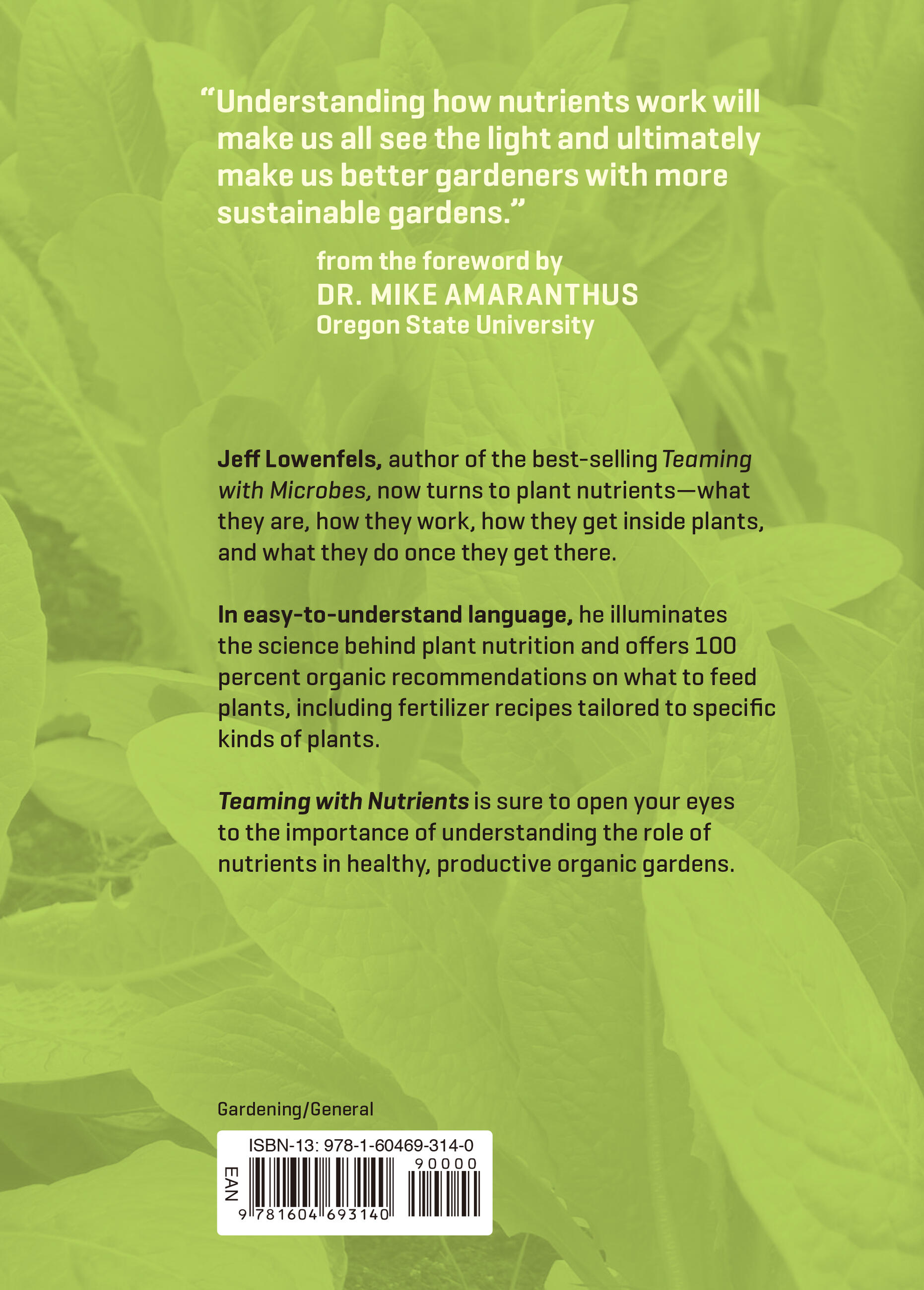 Most gardeners realize that plants need to be fed, but many of us know little about the nature of the science involved. In Teaming with Nutrients, Jeff Lowenfels explains the basics of plant nutrition from an organic gardener’s perspective. In his trademark down-to-earth, style, Lowenfels explains the role of both macronutrients and micronutrients and shows gardeners how to provide these essentials through organic, easy-to-follow techniques. Along the way, Lowenfels provides easy-to-grasp lessons in the biology, chemistry, and botany needed to understand how nutrients get into the plant and what they do once they’re inside.