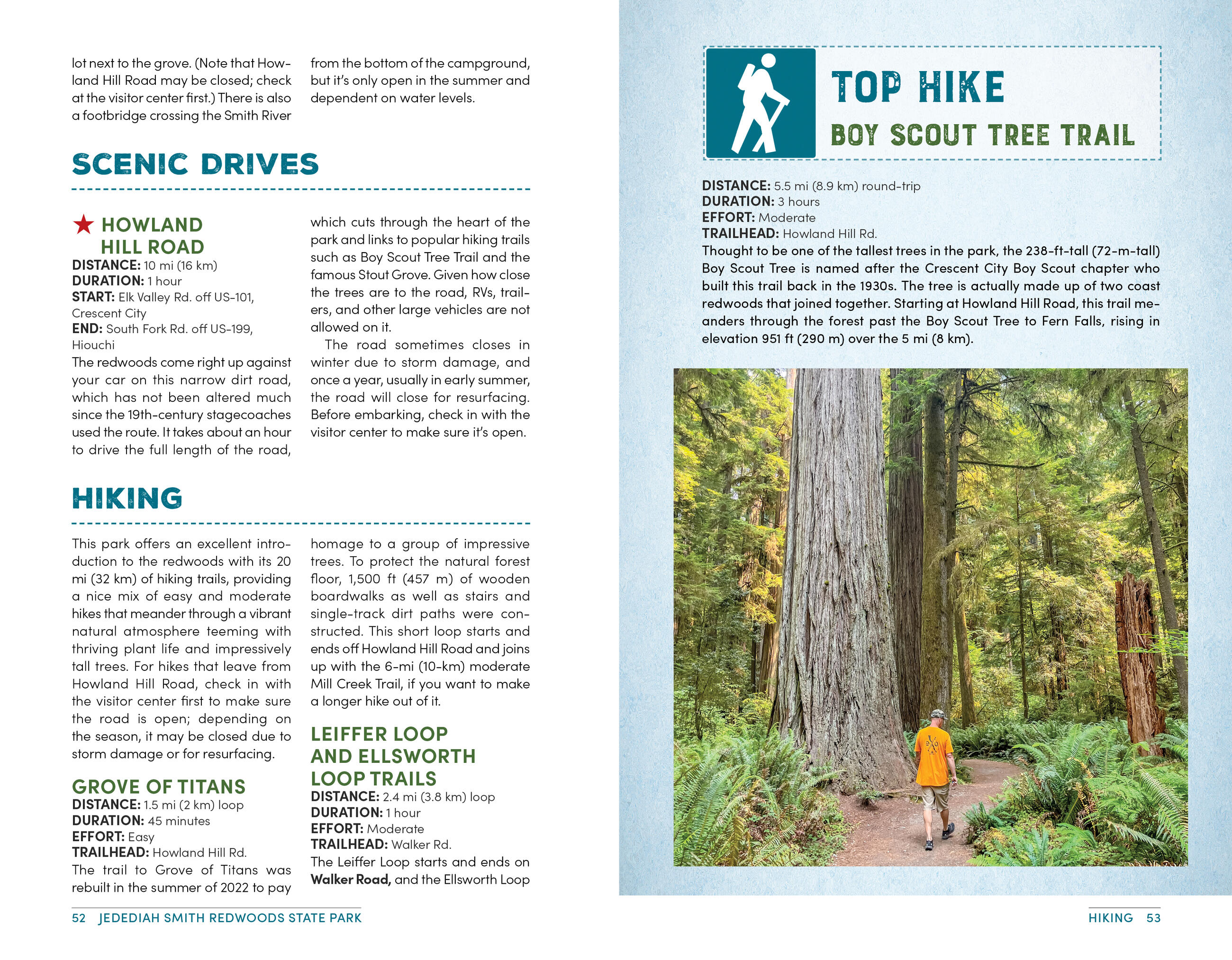 - Detailed hike descriptions marked with distance, duration, effort level, and trailheads