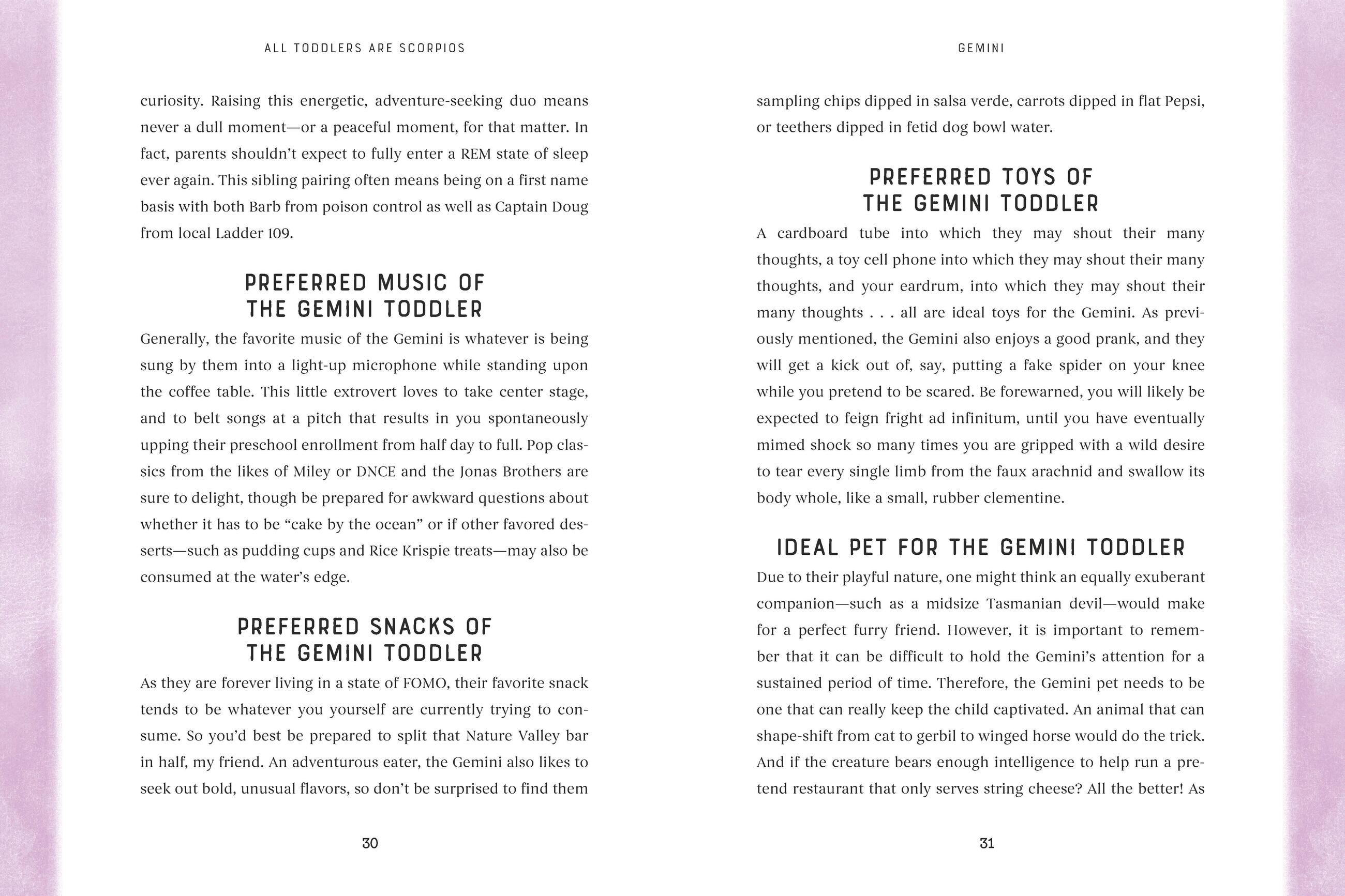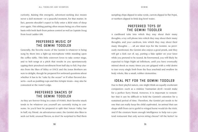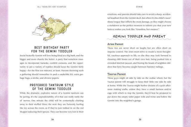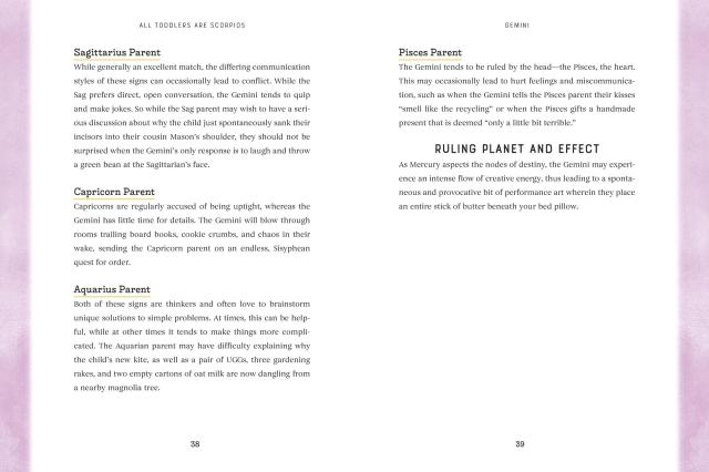 "For centuries, mankind has looked to the stars for guidance. It makes sense that we would turn to them to explain why our toddler is having a full-blown exorcist-level meltdown over the shape of the pasta he has eaten a hundred times before without incident. All Toddlers Are Scorpios is a perfect book for any parent or caregiver who could use a laugh—and something else to blame!"Nicole Tersigni, author of MEN TO AVOID IN ART AND LIFE