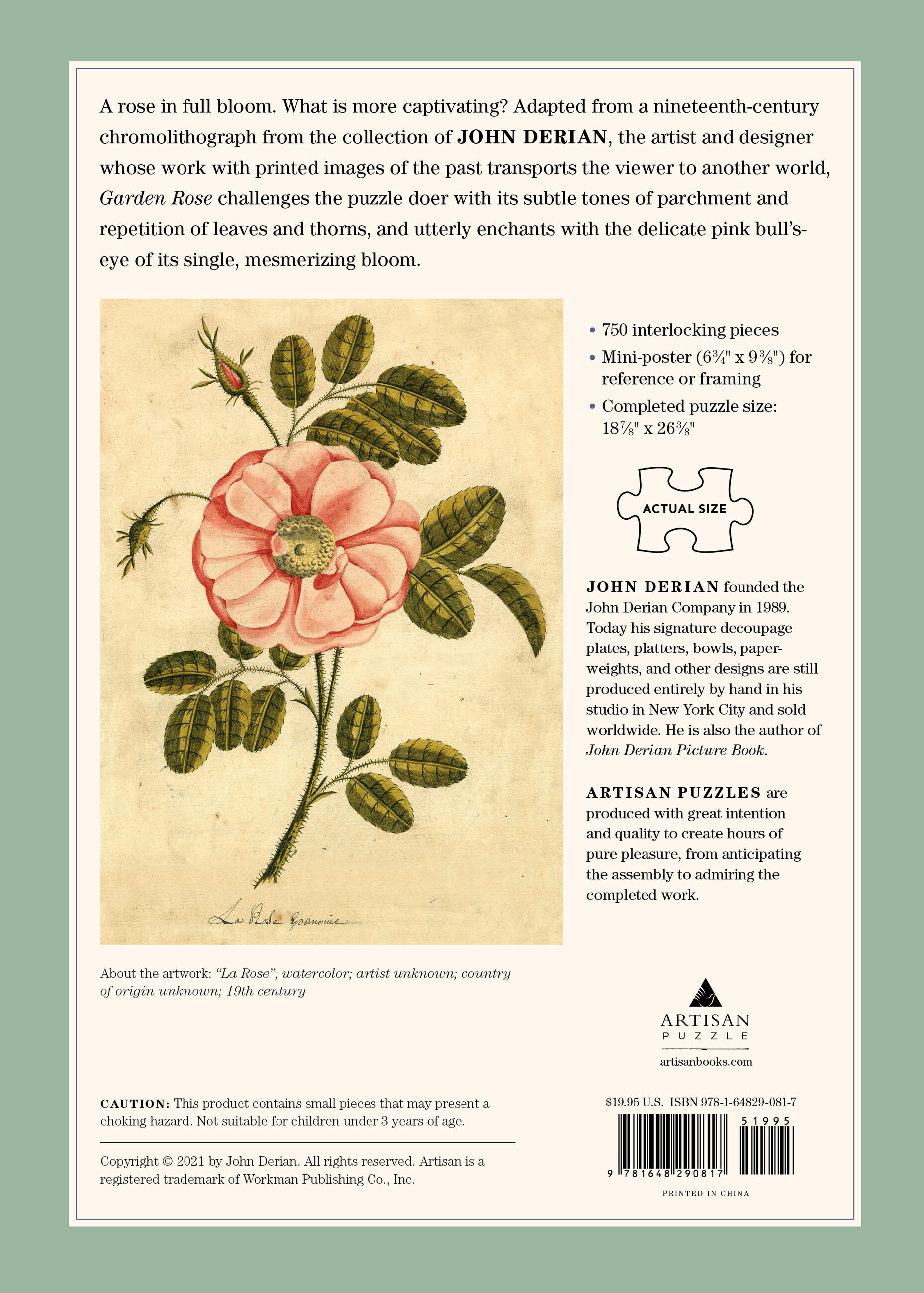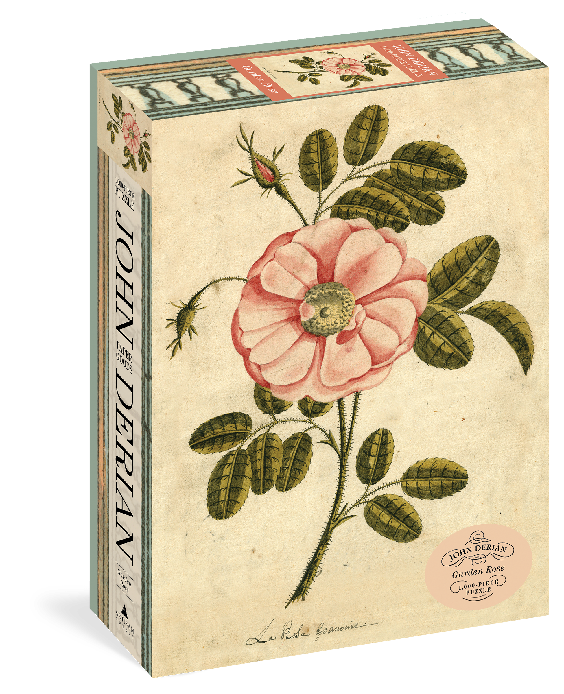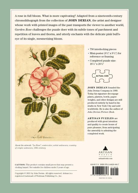 A rose in full bloom. What is more captivating? Adapted from a nineteenth-century chromolithograph from the collection of John Derian, the artist and designer whose work with printed images of the past transports the viewer to another world, Garden Rose challenges the puzzle doer with its subtle tones of parchment and repetition of leaves and thorns, and utterly enchants with the delicate pink bull’s-eye of its single, mesmerizing bloom.
