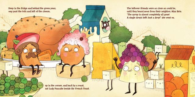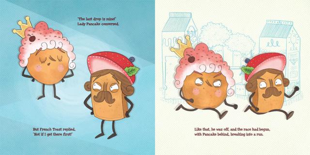 Lady Pancake and Sir French Toast have a beautiful friendship—until they discover that there’s only one drop of maple syrup left! The race is ON! Off they go, racing past the Orange Juice Fountain, skiing through Sauerkraut Peak, and reeling down the linguini.