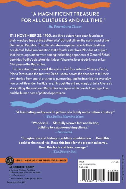 In this extraordinary novel, the voices of all four sisters–Minerva, Patria, María Teresa, and the survivor, Dedé–speak across the decades to tell their own stories, from secret crushes to gunrunning, and to describe the everyday horrors of life under Trujillo’s rule. Through the art and magic of Julia Alvarez’s imagination, the martyred Butterflies live again in this novel of courage and love, and the human costs of political oppression.