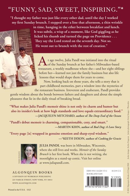 At age twelve, Julie was initiated into the rite of the Sunday brunch, a weekly madhouse at her father’s Milwaukee-based restaurant, where she and her eight older siblings before her did service in a situation of controlled chaos, learning the ropes of the family business and, more important, learning life lessons that would shape them for all the years to come. In her wry memoir, she looks back on those formative years, a time not just of growing up but, ultimately, of becoming a source of strength and support as the world her father knew began to change into a tougher, less welcoming place.