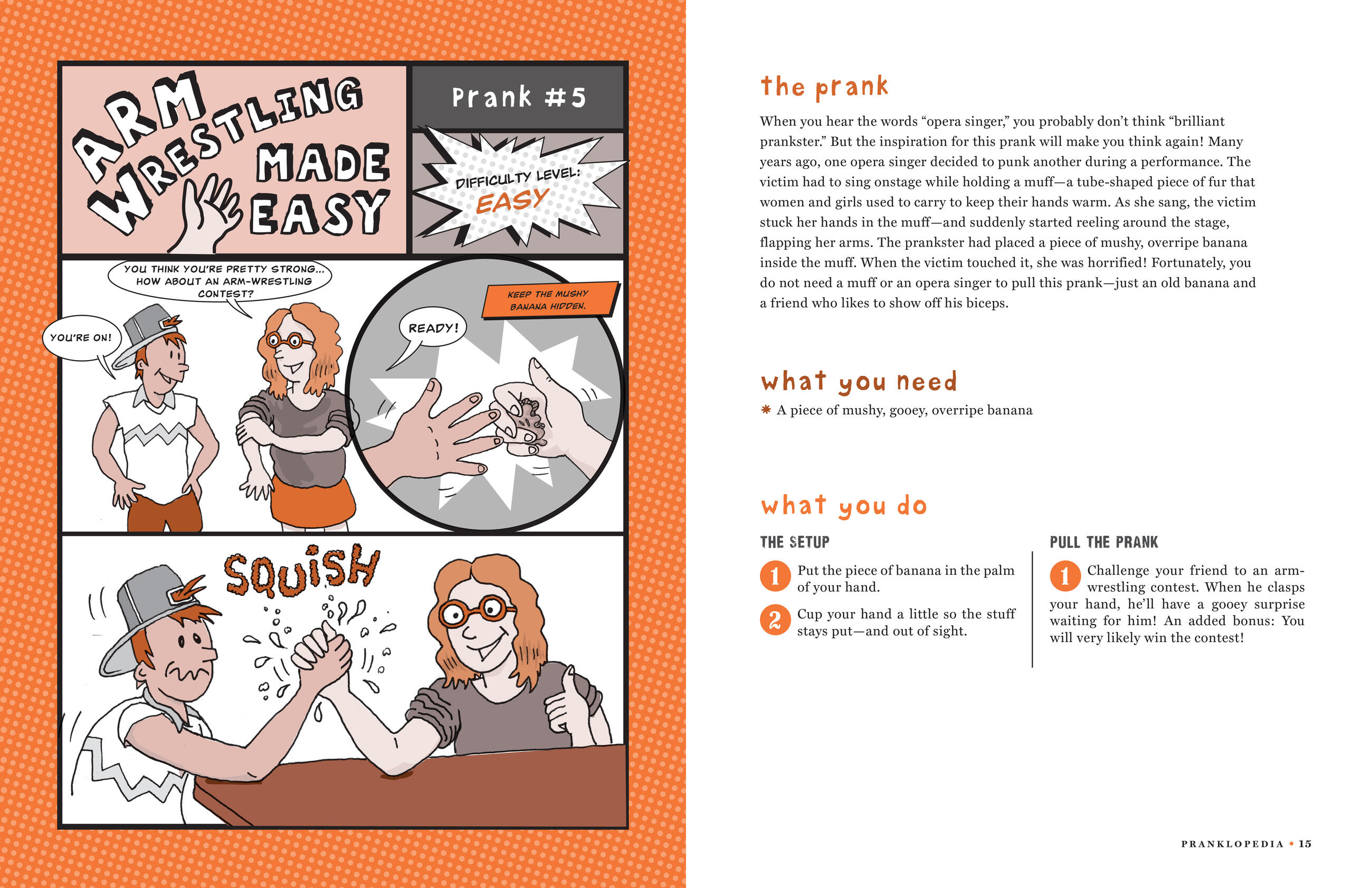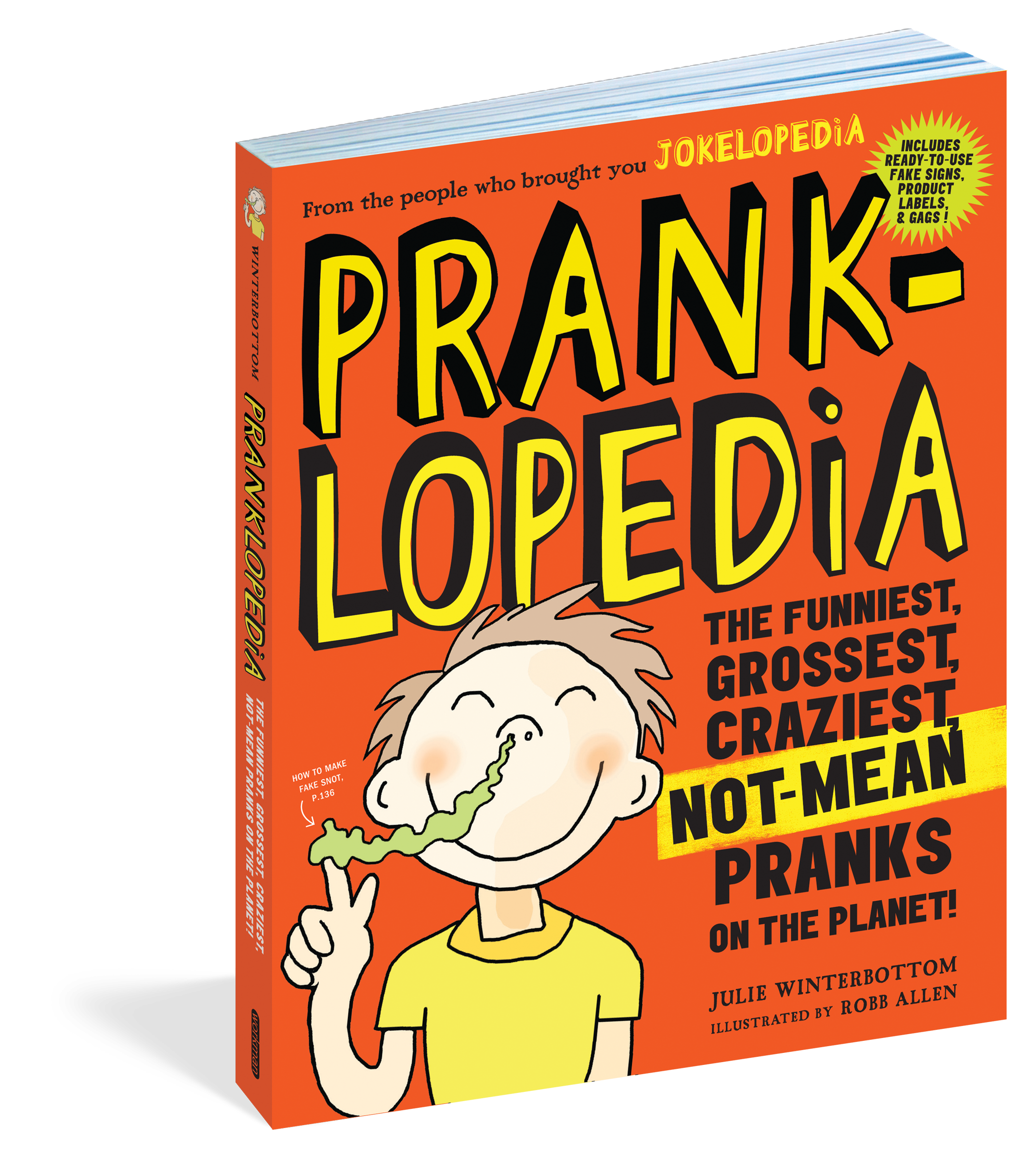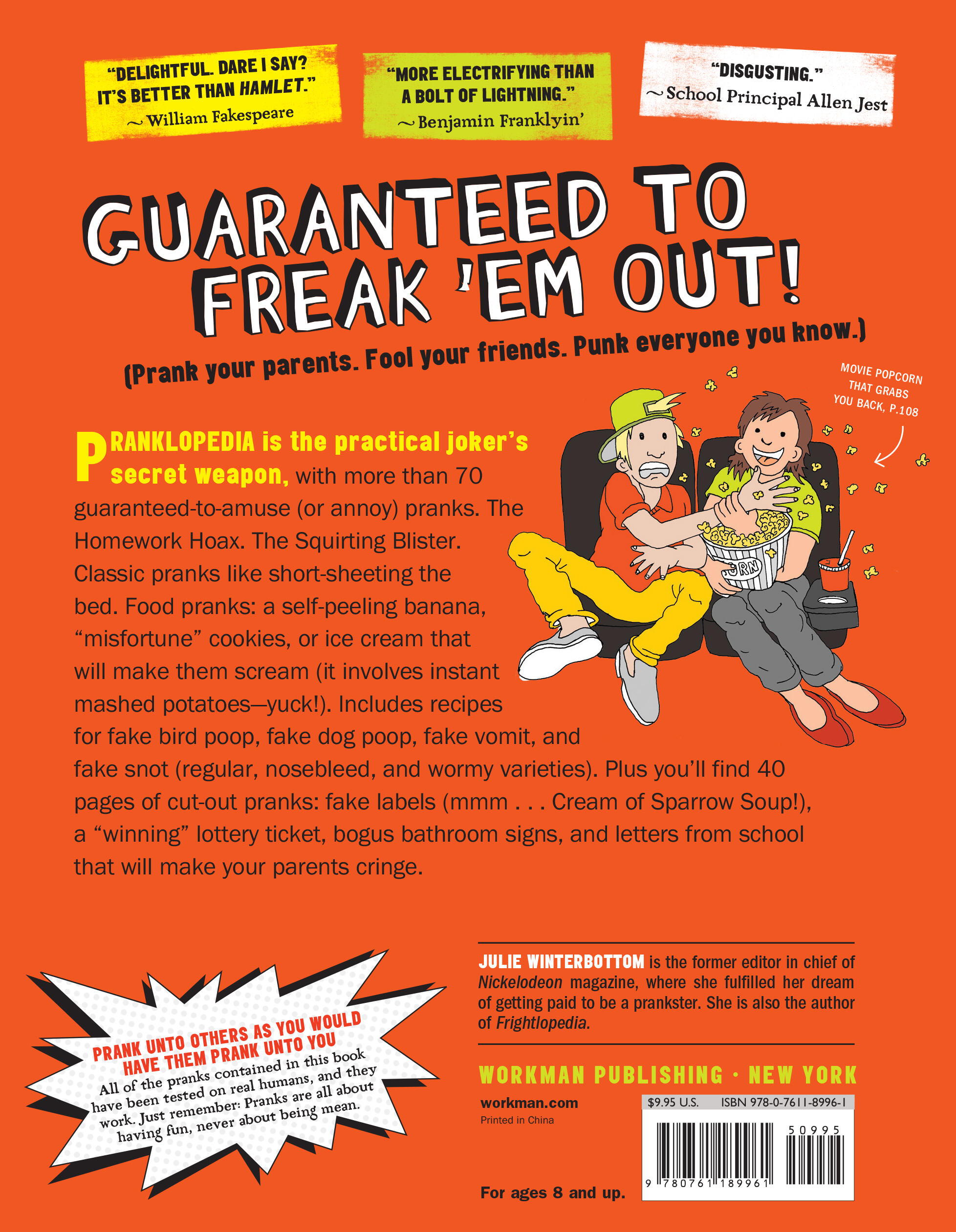 Pranklopedia is the young practical joker’s secret weapon, a boisterous collection of over 70 guaranteed-to-amuse (or annoy) pranks to be pulled on friends, siblings, and parents. Discover the Homework Hoax, the Squirting Blister, the Movie Popcorn That Grabs You Back. Pull classic pranks on your siblings, like short-sheeting the bed. Freak out your friends with food pranks: a self-peeling banana, “misfortune” cookies, or ice cream that will make them scream (here’s a hint—it involves instant mashed potatoes). And there are perfect pranks to pull on your parents, including a scheme to “freeze” the family computer.