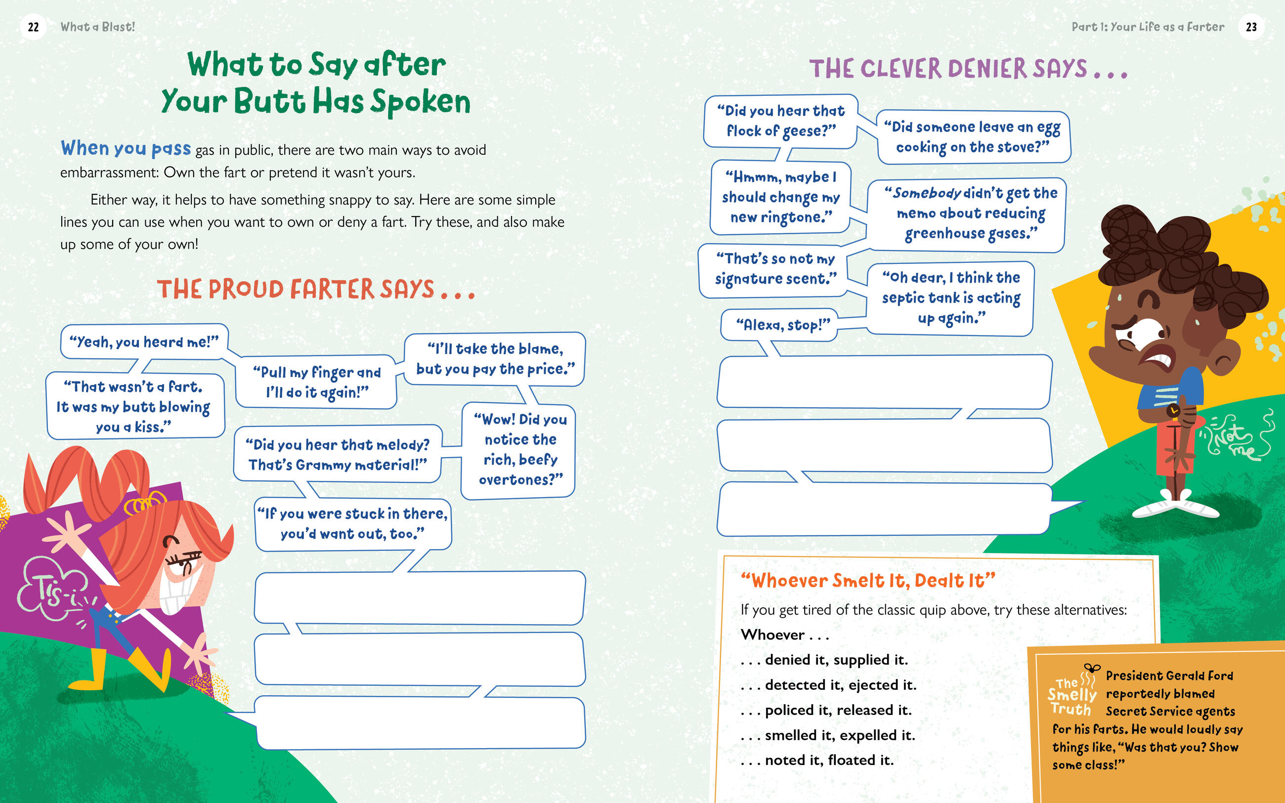 Con-fart-ulations! You’ve found the book that confirms your fine appreciation for the fact that nothings funnier than a little pfffftt from someone’s butt. Cheerfully over-the-top, packed with activities, and grounded in the science of flatulence, What a Blast! Is a trip through the body’s digestive system to explore the whys, hows, and wherefores of farting. You’ll discover the fartiest food in the world, meet infamous farters from history, learn just what to say if you fart in public—“Yeah, you heard me!—and so much more!