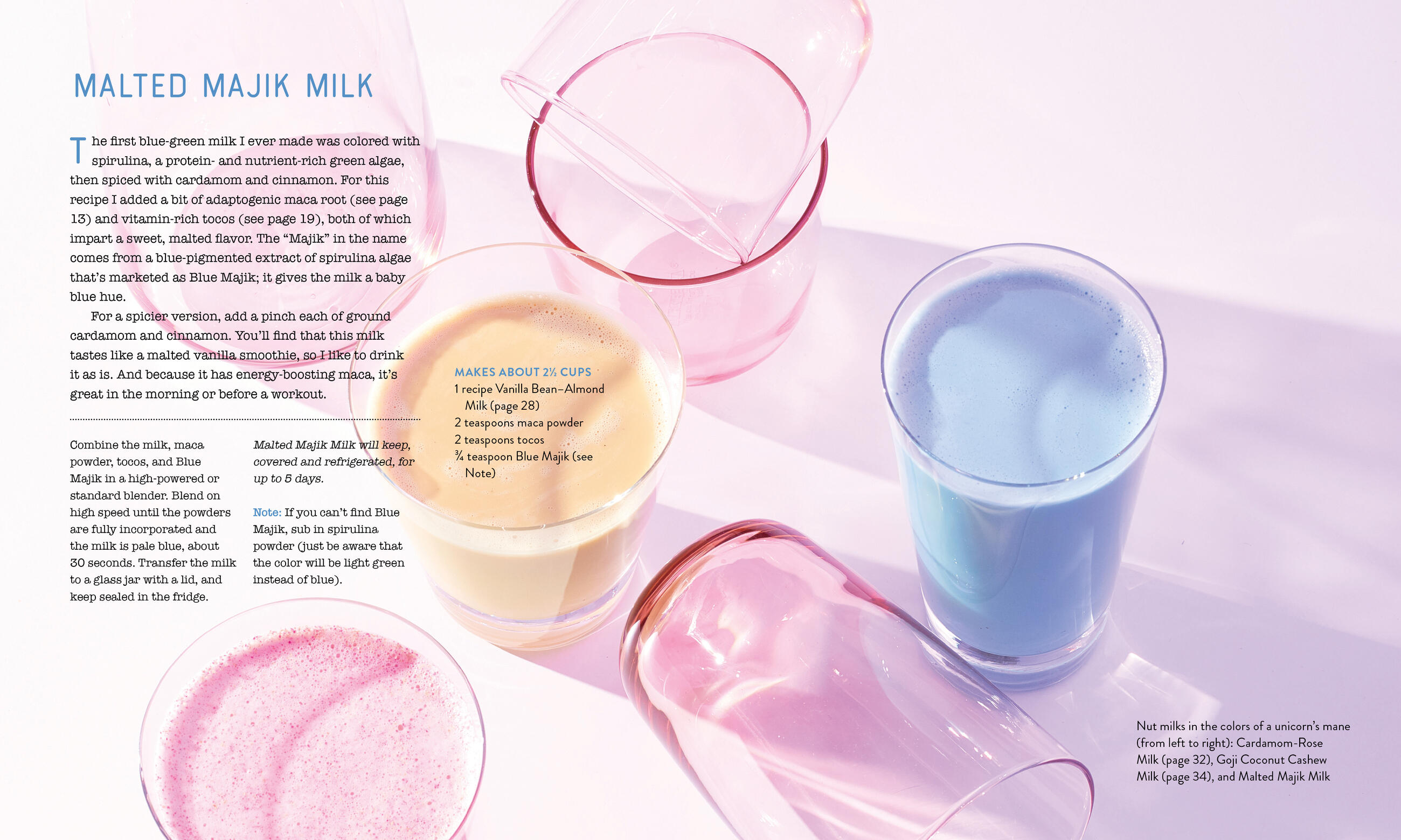 The ingredients are all natural and nutrient packed, ranging from fresh fruits and vegetables to superfoods like flax seeds, coconut oil, spirulina, chia, and bee pollen. And the hyper-colorful, creative recipes are perfect for healthy-forward eaters, including gently flavored nut milks, grain bowls loaded with fresh vegetables, probiotic breakfast custards, toasts with slathers and spreads. This is health food filled with joy, and in all the colors of the rainbow: the deep glowing yellow of a Frozen Turmeric Lassi, the greens of Bean Thread Noodle Salad with Miso-Arugula Pesto, the intense oranges and purples of Sweet + Sour Rainbow Radish Tacos, the tie-dye rainbow effect of Pineapple Kimchi Summer Sunset Rolls, and the pastels of Strawberry-Pink Peppercorn “Ice Cream” Sticks.