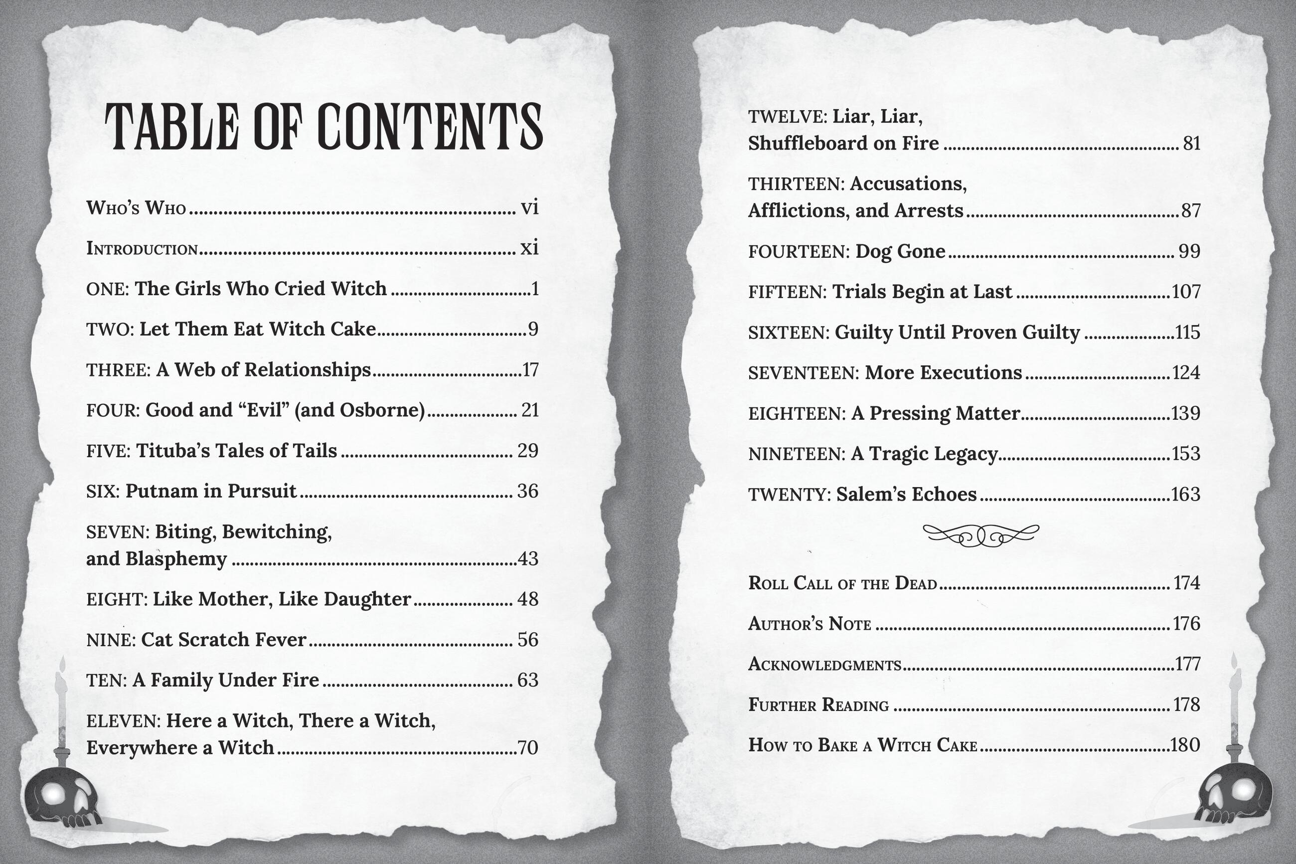 But who were the witches? Everyone knew that too: the unprotected residents of Salem—the poor, the elderly, the ones who were a little bit strange. Soon more girls were having fits and naming people as witches. The village erupted in accusations, suspicion, and fear. By the time the witch trials ended, dozens of lives had been ruined, and twenty people were dead.
