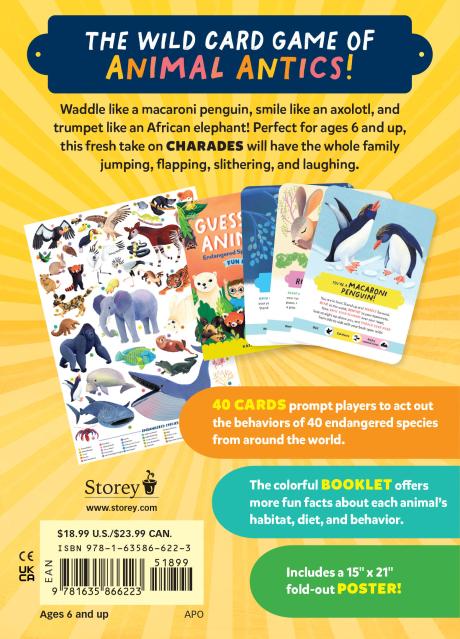 The charade activities in the card game Guess My Animal! introduce kids to the amazing and weird behaviors of 40 different animals: Roll into a ball like a frightened pangolin. Take a break and lie face down on the floor like a sunflower starfish. Hang around, slowly chewing, like a pygmy three-toed sloth. Crack shells on your belly like a sea otter. Smile and wave your frilled gills like an axolotl. Lie in wait, then lunge for your pray like a crocodile. Hunch up your shoulders, look down, and pretend to vomit on yourself like a nervous California condor!From the aye-aye to the colorful puffleg hummingbird and the golden poison frog, every animal is featured on its own colorfully illustrated card along with simple instructions on how to act out one aspect of that animal’s distinctive behavior and challenge the other players to identify the animal. The deck is accompanied by instructions for beginner, middle level, and advanced players, a poster showing all of the 40 featured animals, and a booklet with more interesting information about each animal. This creative play card game makes learning fun and engaging for kids ages 6 and up, along with their adults.