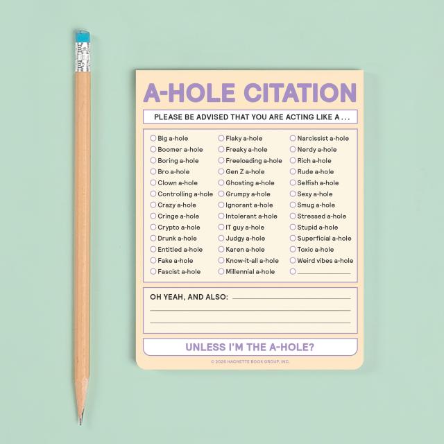 A-HOLE CITATION alerts someone on the spot when they are exhibiting real ass-holey-ness behaviors! Whether it’s family members, friends, or strangers, this little pad helps get the point across. Laugh-out-loud checkbox options speak to the tenor of our times and convey the nuances of exasperation in hilarious specificity—with extra room for personalization.