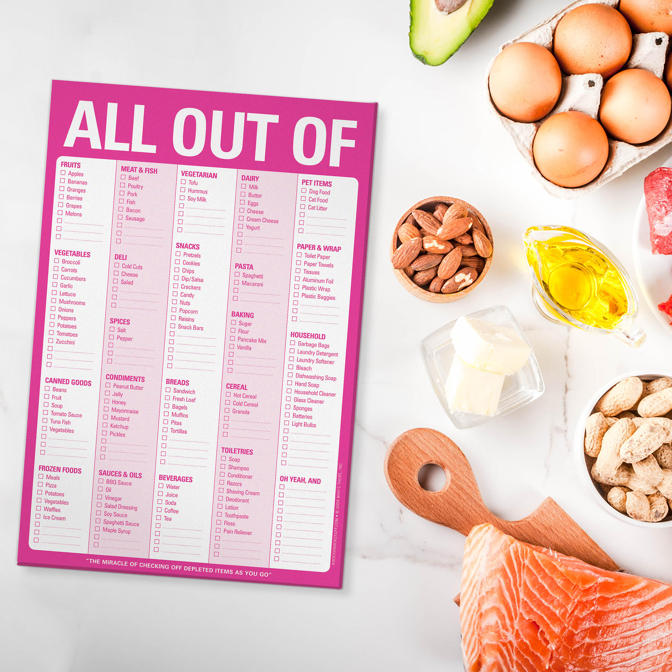 Who hasn’t wandered blindly at the grocery store, trying to remember what to buy? Now available in a shock-and-awe shade of pink, this perennial favorite lets you check off depleted items as you run out, then replenish with ease and certainty when next you shop.