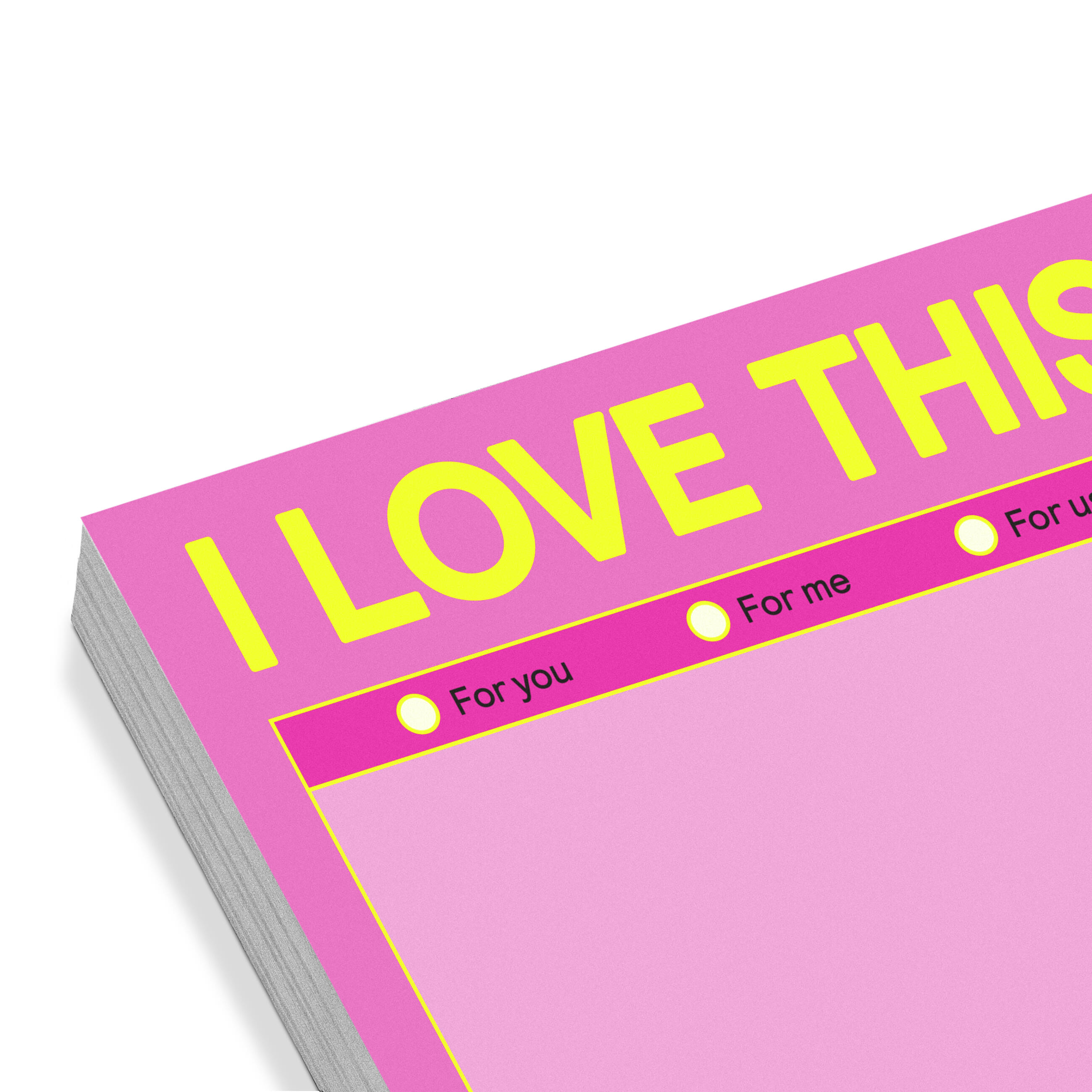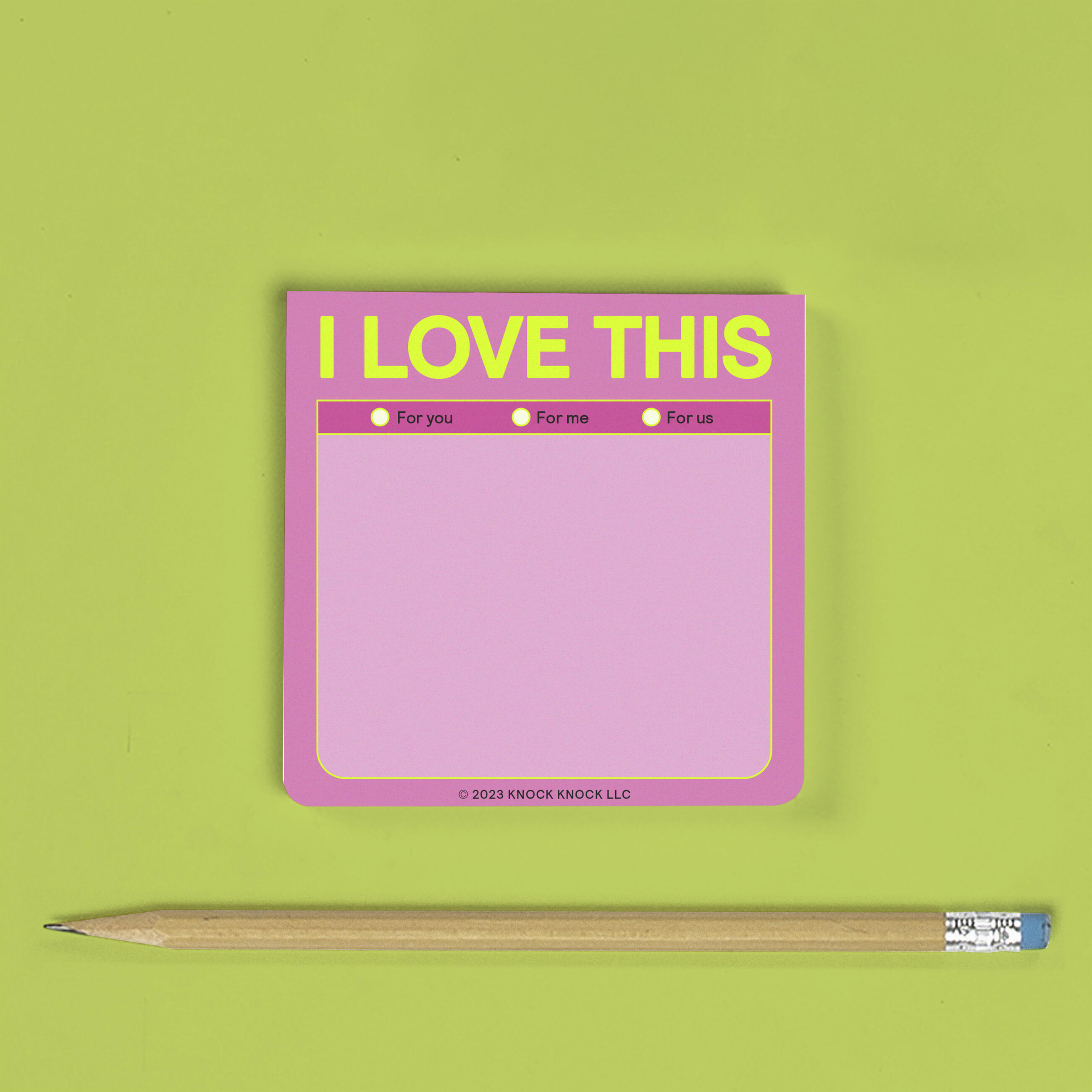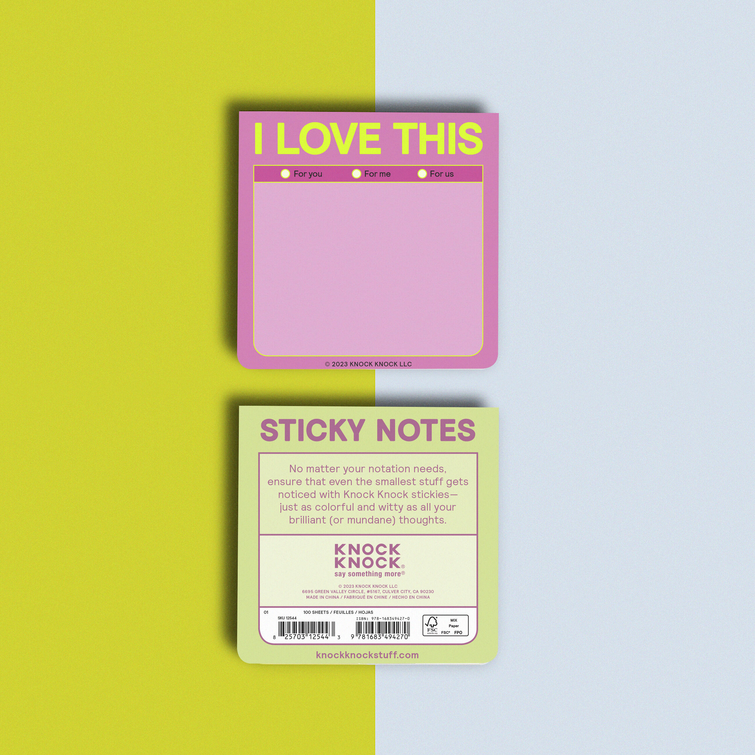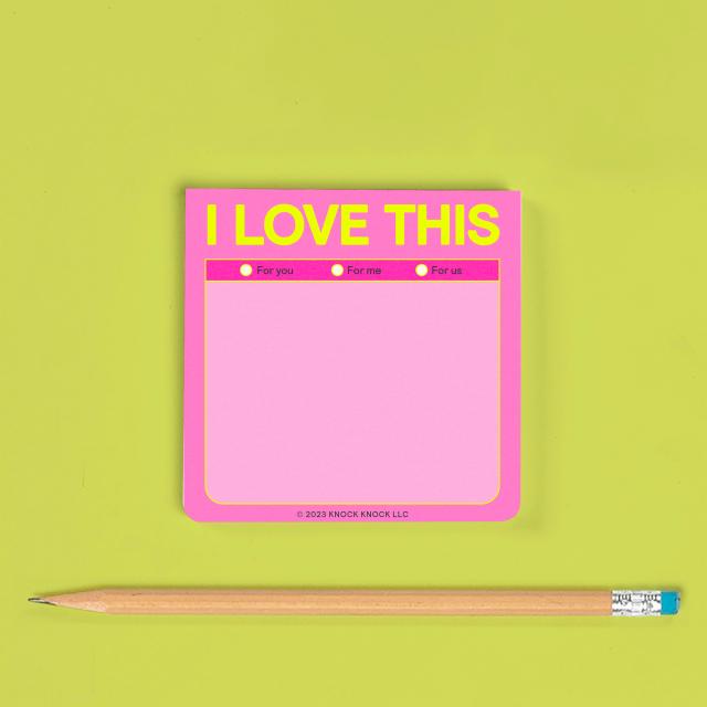 Use these colorful sticky notes to say “I love this,” write love notes, or simply jot your to-do list notes! Knock Knock sticky pads are down for whatever.