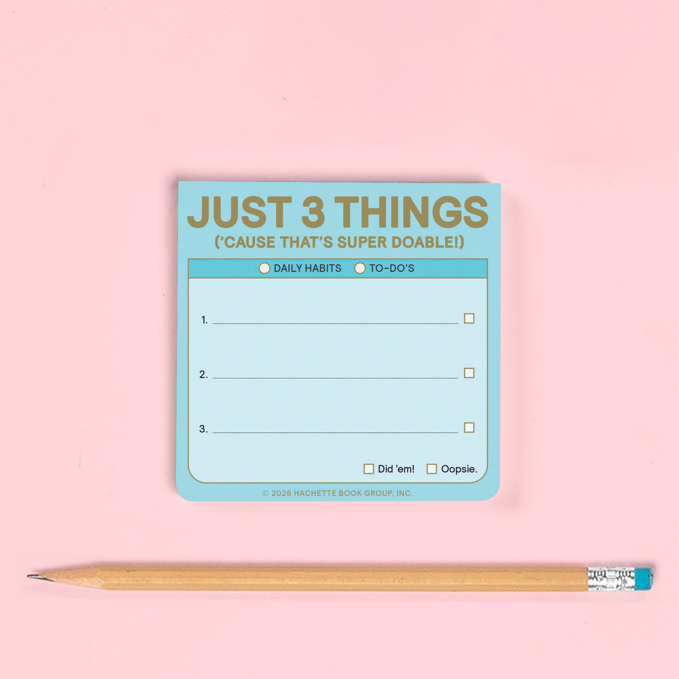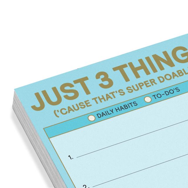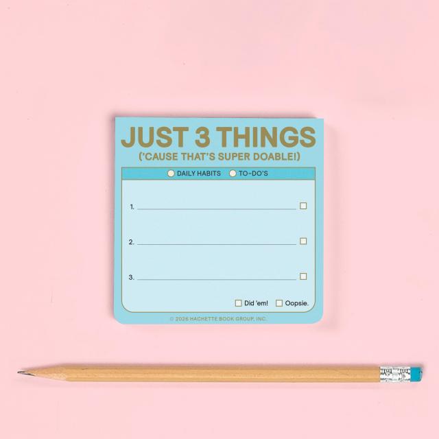 The Just 3 Things sticky note is here to help people maintain or develop three habits a day—in a friendly, portable, easy-peasy format. With 100 adhesive sheets, it’s perfect for jotting down daily goals and short reminders to self that are sure to stick!