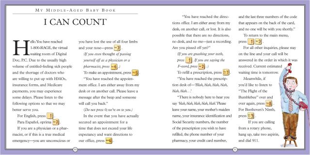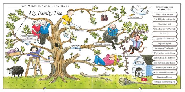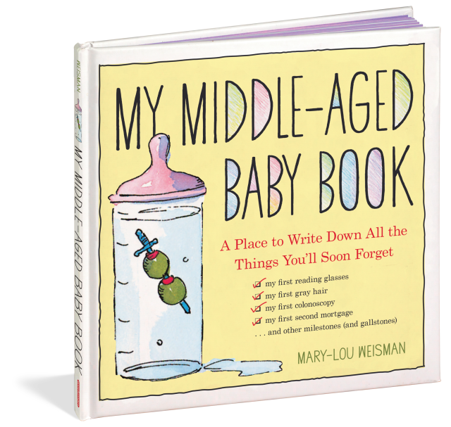 A comic classic, My Middle-Aged Baby Book is the irrepressibly cheeky celebration of middle age in the form of a fill-in baby book—and the perfect gift for both women (“Is it hot in here, or is it just me?”) and men (remember, it’s prostate not prostrate). It’s a place to record firsts: my first colonoscopy, my first reading glasses, my first words (“everything hurts”). Vital statistics: including married name(s), circumference of abdomen, cholesterol count (bad HDLs, good HDLs). Primary caregivers: urologist, periodontist, colorist. It explains the Seven Stages of Hair Loss, answers the question Am I Smiling . . . or Is It Gas?, covers Sex? (Check one: Yes, No, Can’t Remember), and what happens When I Grow Up—go ahead, be a burden to your children!
