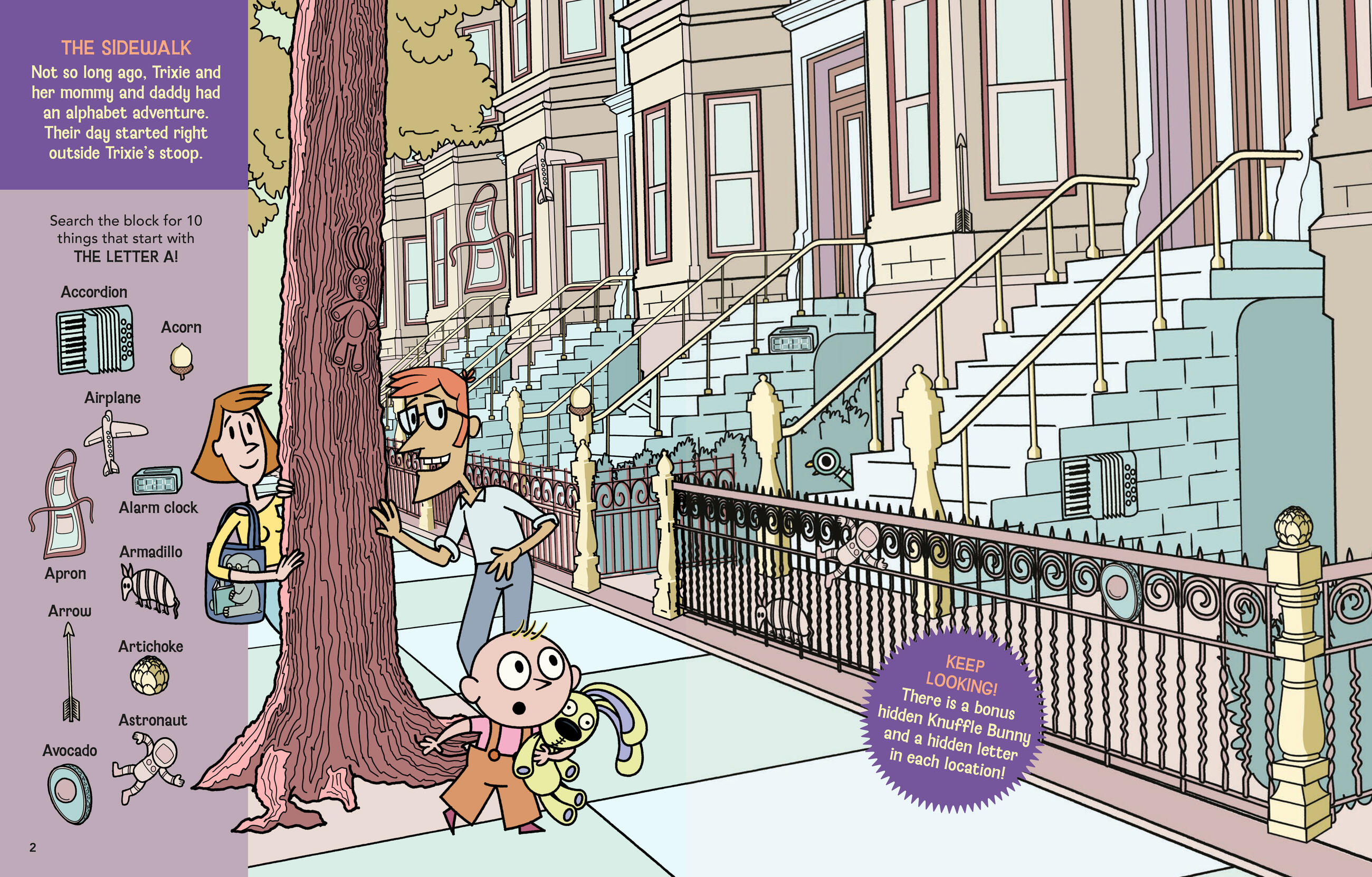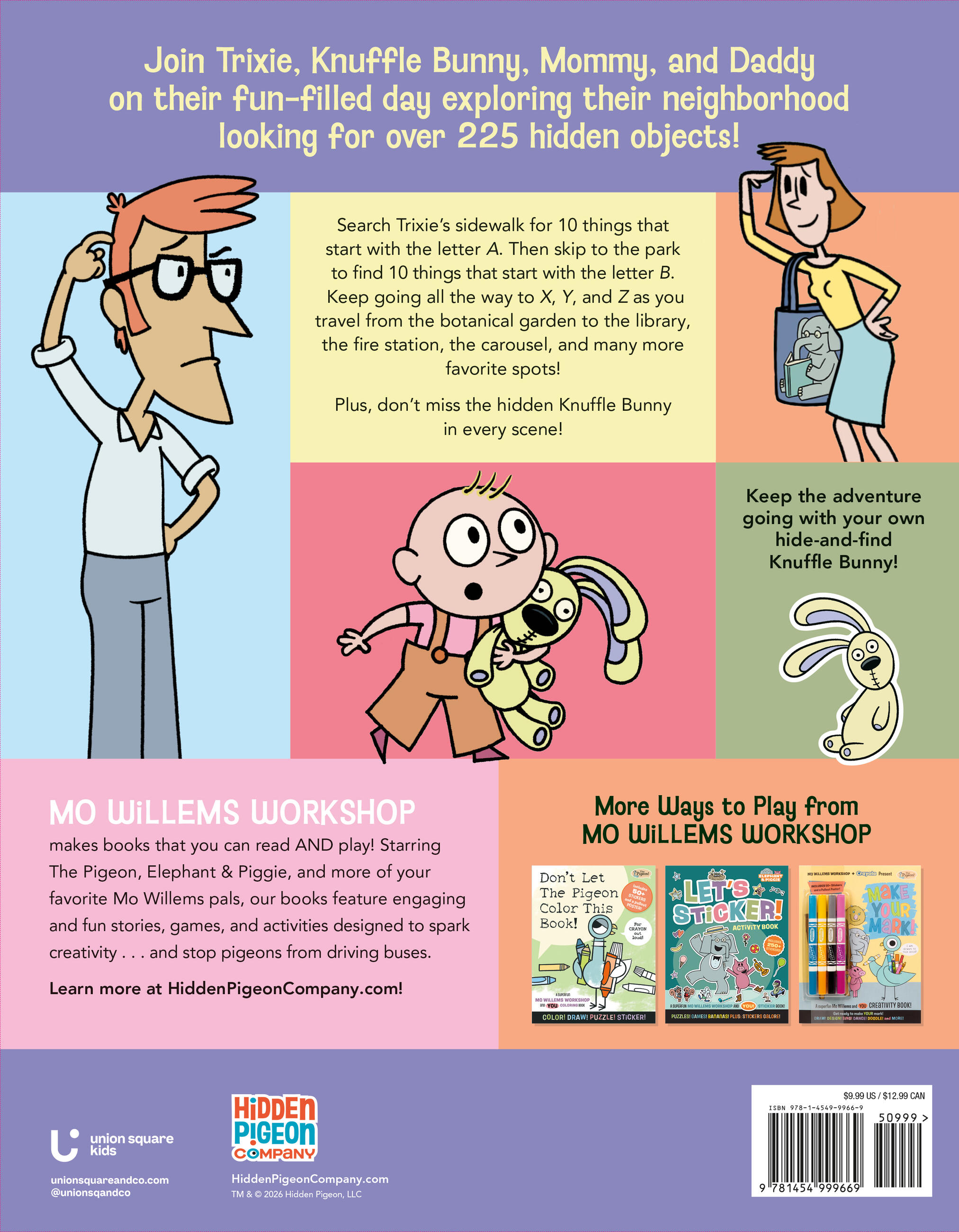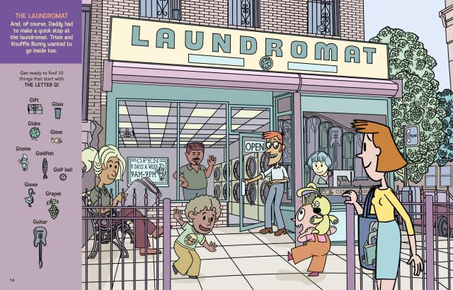 Not so long ago, Trixie, Knuffle Bunny, and her mommy and daddy had an alphabet adventure day! Together they searched the sidewalk, the park, the botanic garden, the subway, the fire station, the carousel, the pizza parlor and more looking for objects from A to Z. Join Trixie and Knuffle Bunny on their fun-filled day exploring 20 exciting neighborhood scenes with over 225 hidden objects to discover! Plus, get a pop-out Knuffle Bunny to hide and find around your own neighborhood!