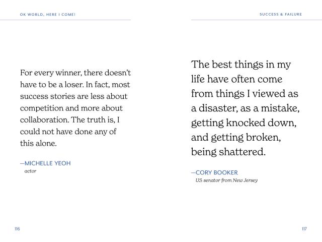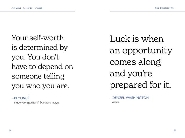 OK, World, Here I Come! is an invaluable book for graduates as they launch into the next chapter of life. Organized by themes such as Self-Care, Success & Failure, Work Ethic, and more, each quote is carefully selected to evoke confidence, motivation, and encouragement for the reader.