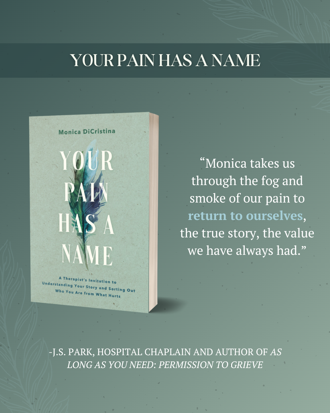 “Our worth is often a treasure buried. Monica gets to excavating the truth: Our worth was always there, and our pain was telling us a different story. In Your Pain Has a Name, Monica takes us through the fog and smoke of our pain to return to ourselves, the true story, the value we have always had. From her time-tested experience and compassion-held knowledge, you will find the wealth of your worth here.”J. S. Park, hospital chaplain and author of As Long As You Need: Permission to Grieve