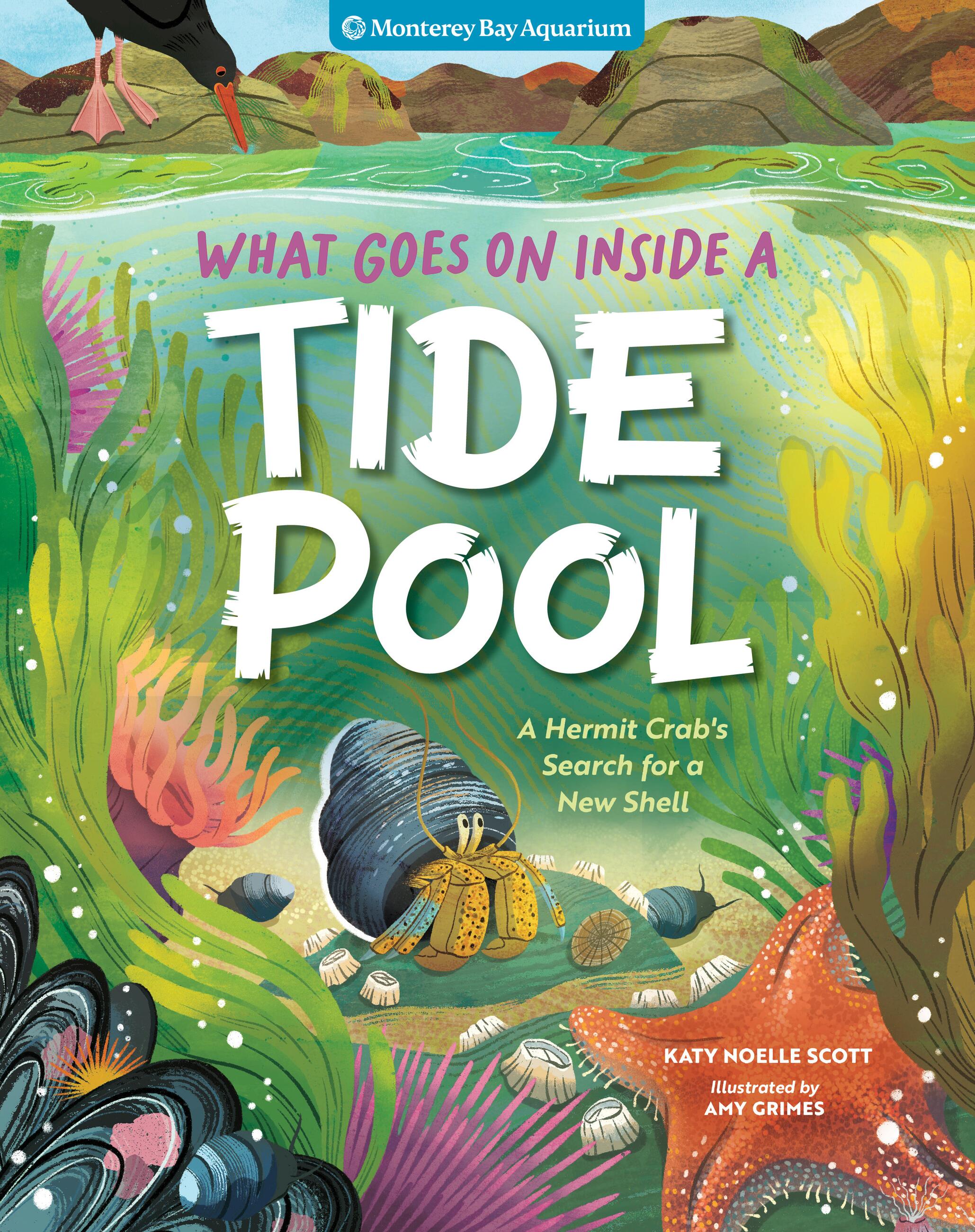 In a great tide pool along the central coast of California, what from afar looks like just a rocky outcropping comes to life with color and drama as a hermit crab searches for a new, larger shell. The crab must survive extreme conditions through the course of a tide cycle–encountering crashing waves, hungry predators, and a neighborhood of diverse animals–in order to find her new home. While following the crab’s story through gorgeous, paneled illustrations, readers will also learn about the adaptations of a wide variety of creatures, why tides happen, the tide pool food web, and more through sidebars and photos.