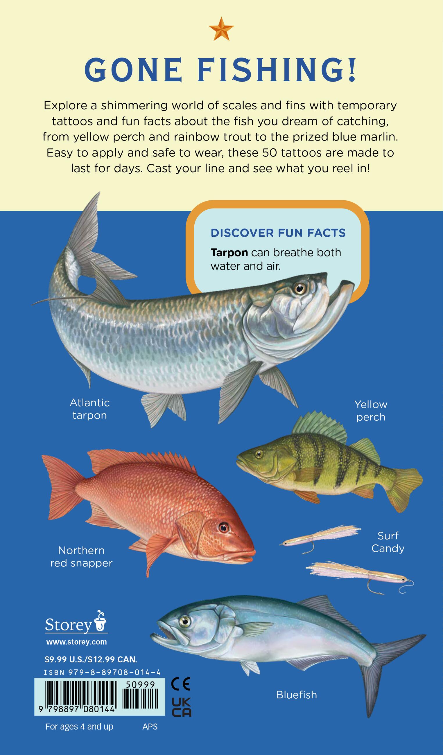 Educational: Each tattoo is paired with a fun fact about fish, from trout to tuna and bluegill to barracuda.
