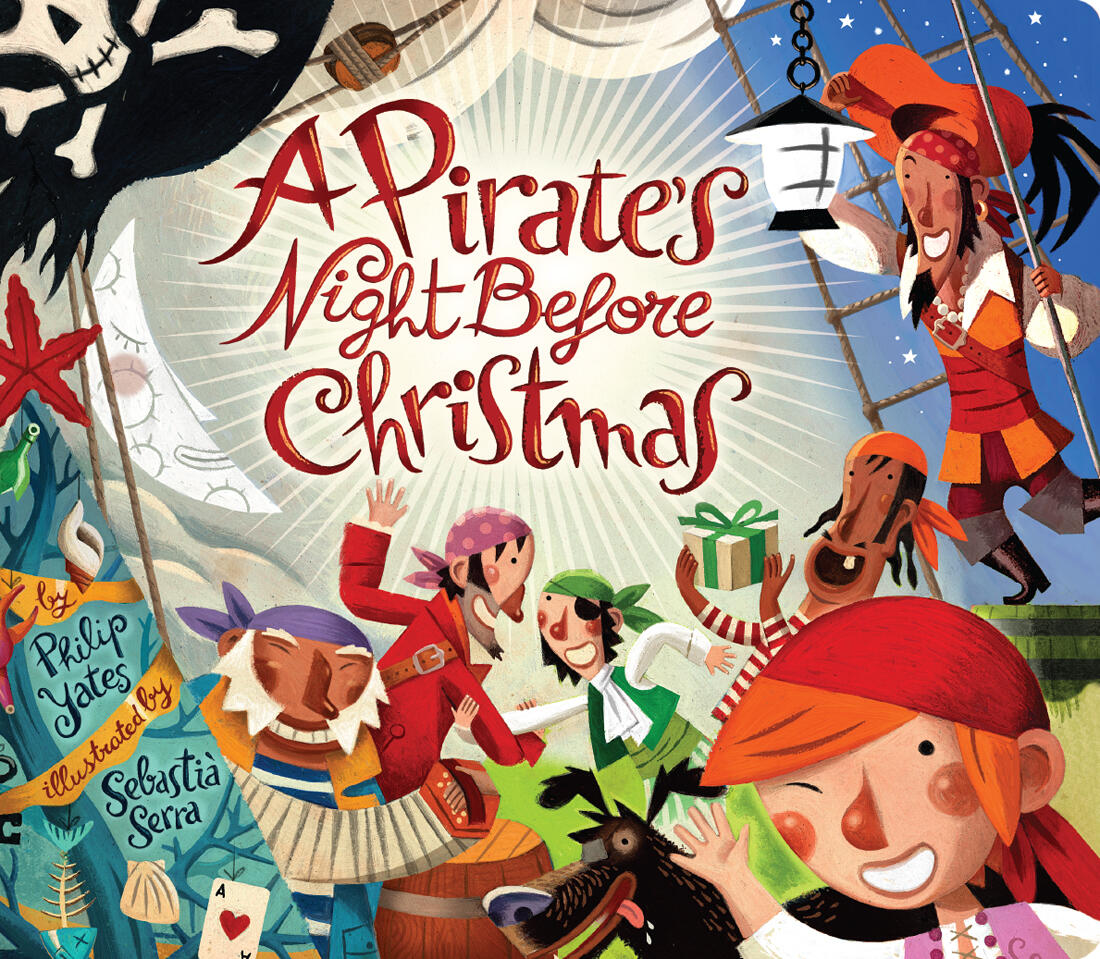With impeccable rhythm and a great sense of fun, Philip Yates skillfully adds pirate adventure to Clement C. Moore’s beloved Christmas story. Written from the point of view of a young boy on a pirate ship, the book details his discovery of Sir Peggedy’s arrival aboard the ship and all of the excitement that follows. Yates’s energetic use of pirate language and Sebastià Serra’s vibrant illustrations, full of clever details, combine to create a world all their own.