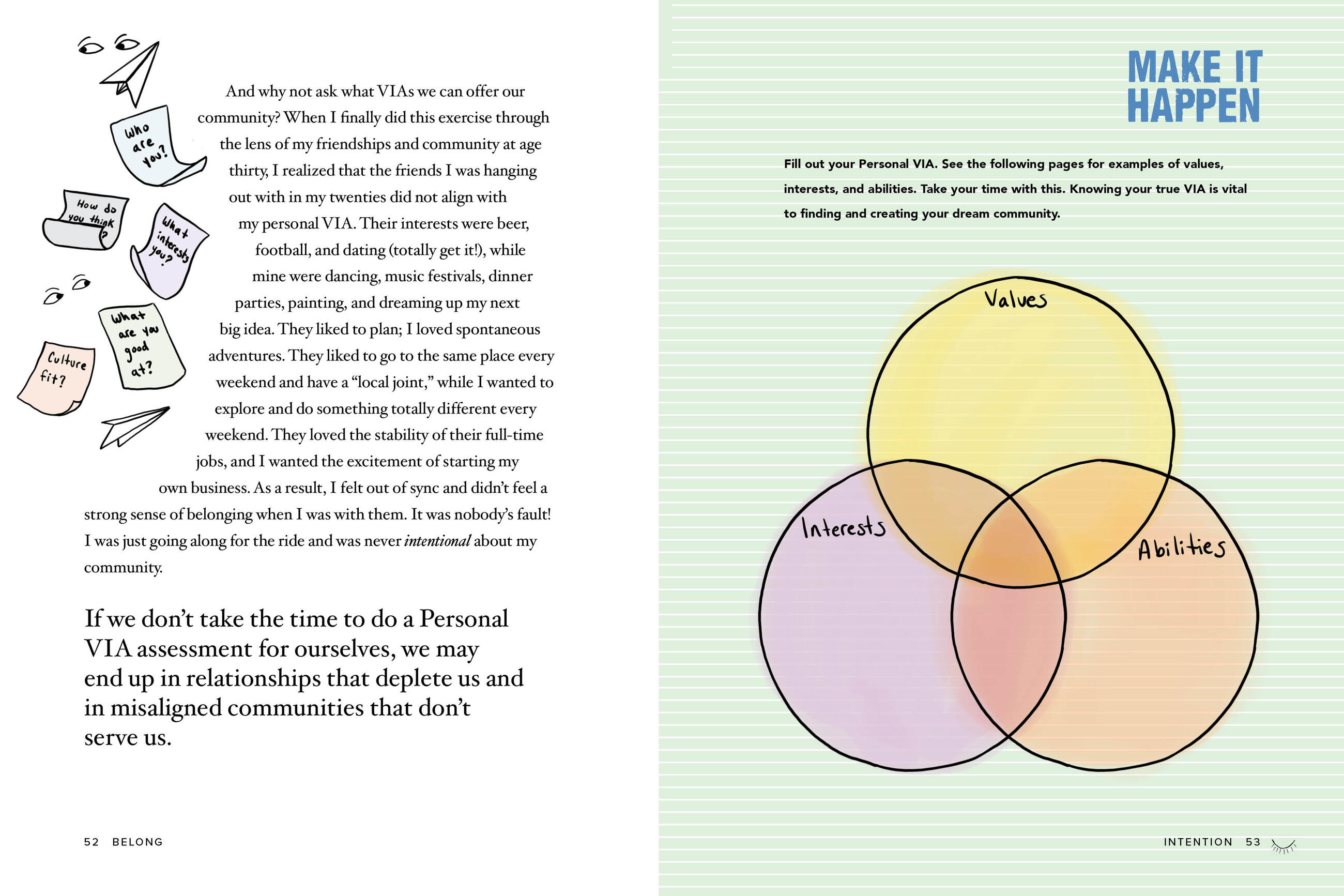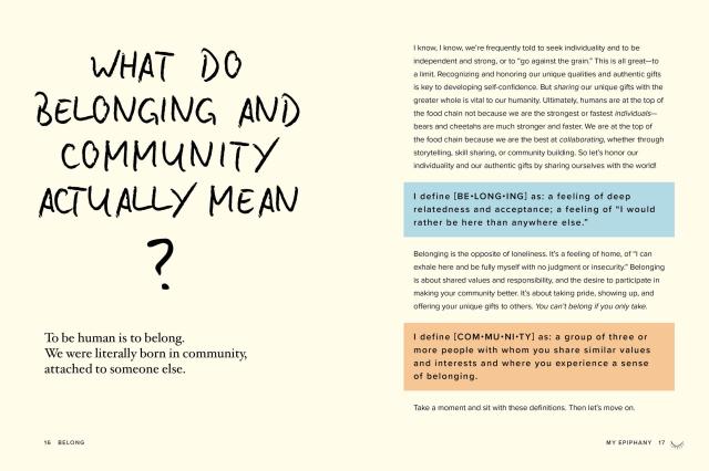 A book that’s equal parts inspiring and interactive, and packed with prompts, charts, quizzes, and full-color illustrations, Belong takes readers on a two-part journey. Part one is Going IN—a gentle but intentional process of self-discovery and finding out your true energy levels and VIA (values, interests, and abilities). Part two is Going OUT—building on all that you’ve learned about yourself to find those few special people who feed your soul, and discovering, or creating, the ever-widening groups that align with your aims and desires.