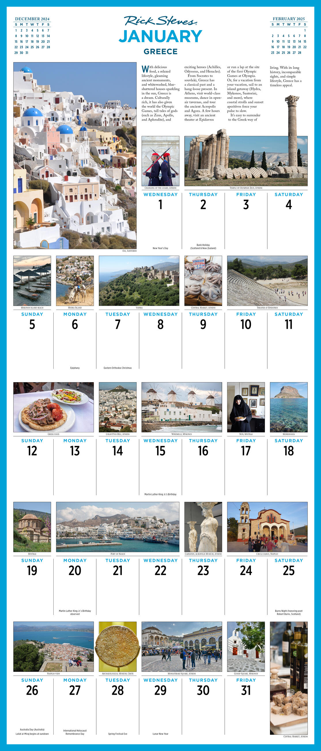 - GREAT GIFT: Ideal for anyone who wishes they could spend all year traveling, this is the ultimate calendar for Europe aficionados. Each month features a bucket-list destination with a map, itinerary, highlights, and over 20 photos throughout the grid.