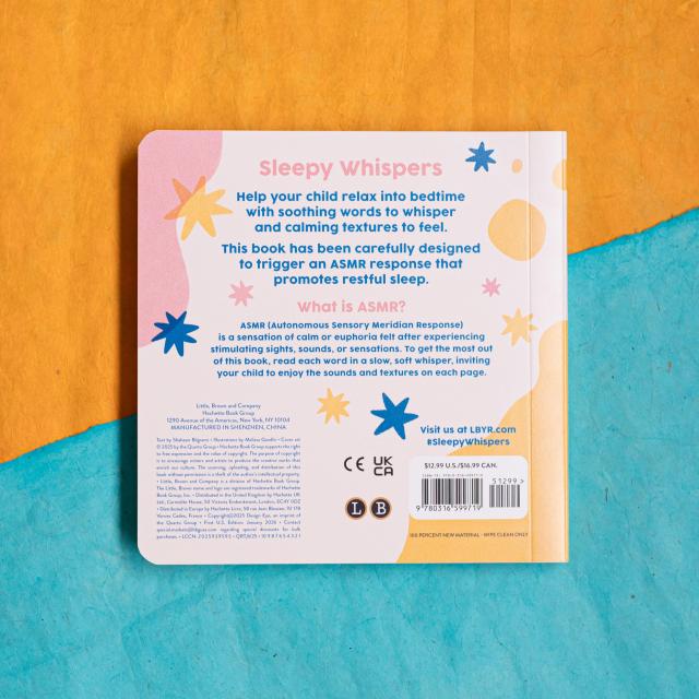 Sleepy Whispers is a tactile, soothing book designed to calm and relax. Every spread features high-quality textures that work with the text and illustrations to trigger an Autonomous Sensory Meridian Response. ASMR is a physical sensation of calm or euphoria, sometimes described as a gentle tingle, that promotes restful sleep, reduces anxiety, and also aids neurodiverse children in self-regulation. Featuring a calming text to whisper-aloud, a repetitive counting element, and an interactive design that encourages bonding between adult and child, this gentle book is the perfect addition to any peaceful bedtime routine.